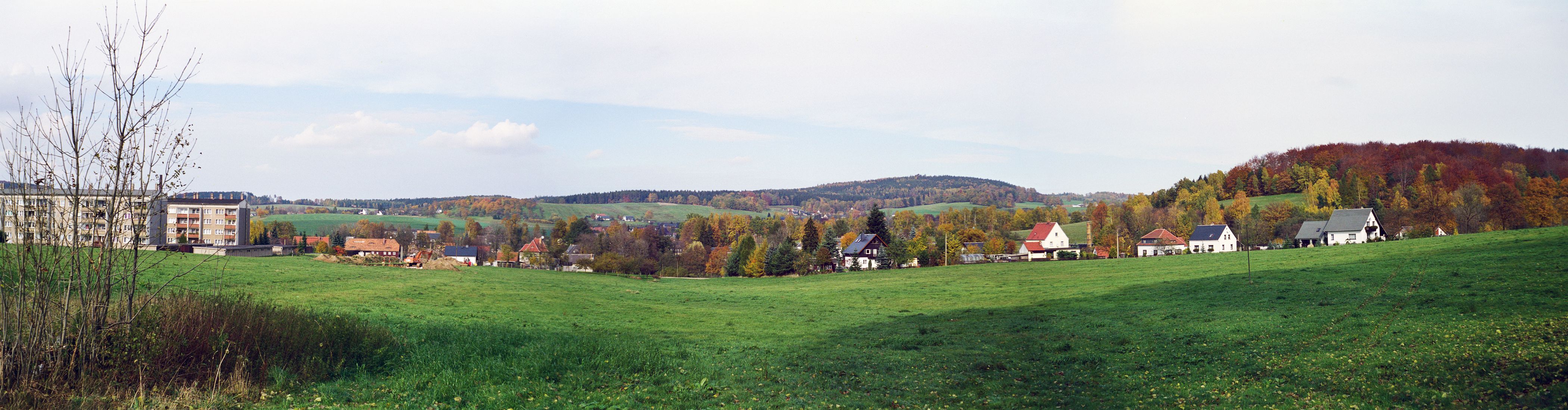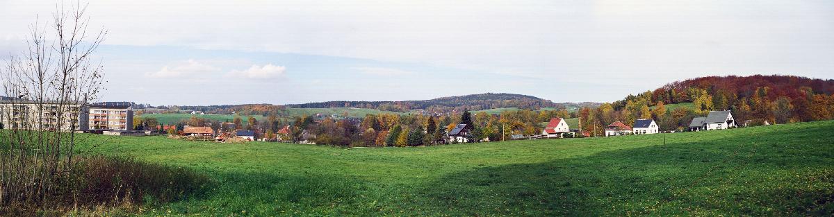 Blick auf Oppach von der Oberen Waldstraße auf Hans-Eisler-Siedlung (links), Zumpestraße (mittig) mit Bieleboh im Hintergrund, Hinterecke (rechts) mit Wilhelmshöhe