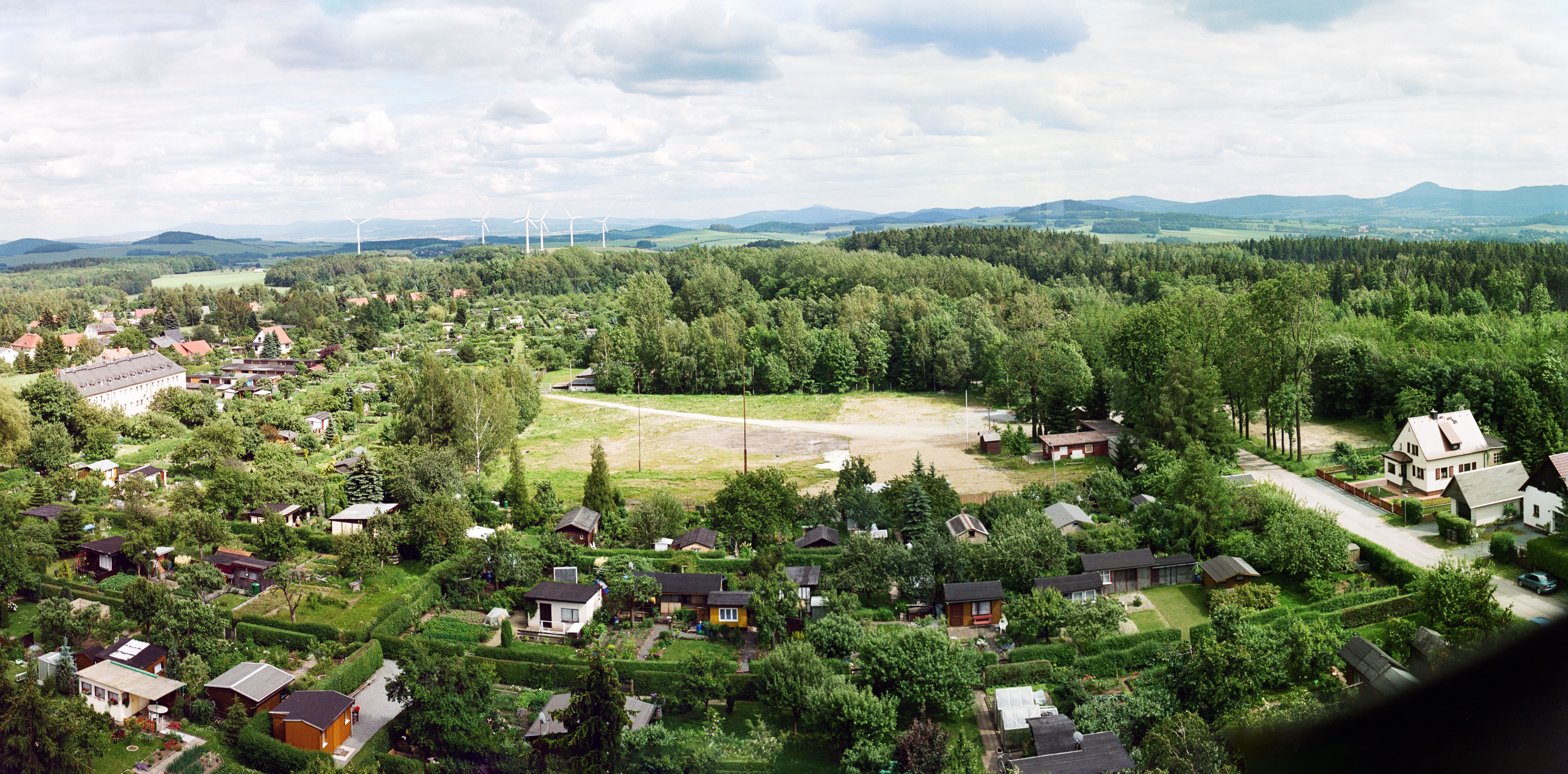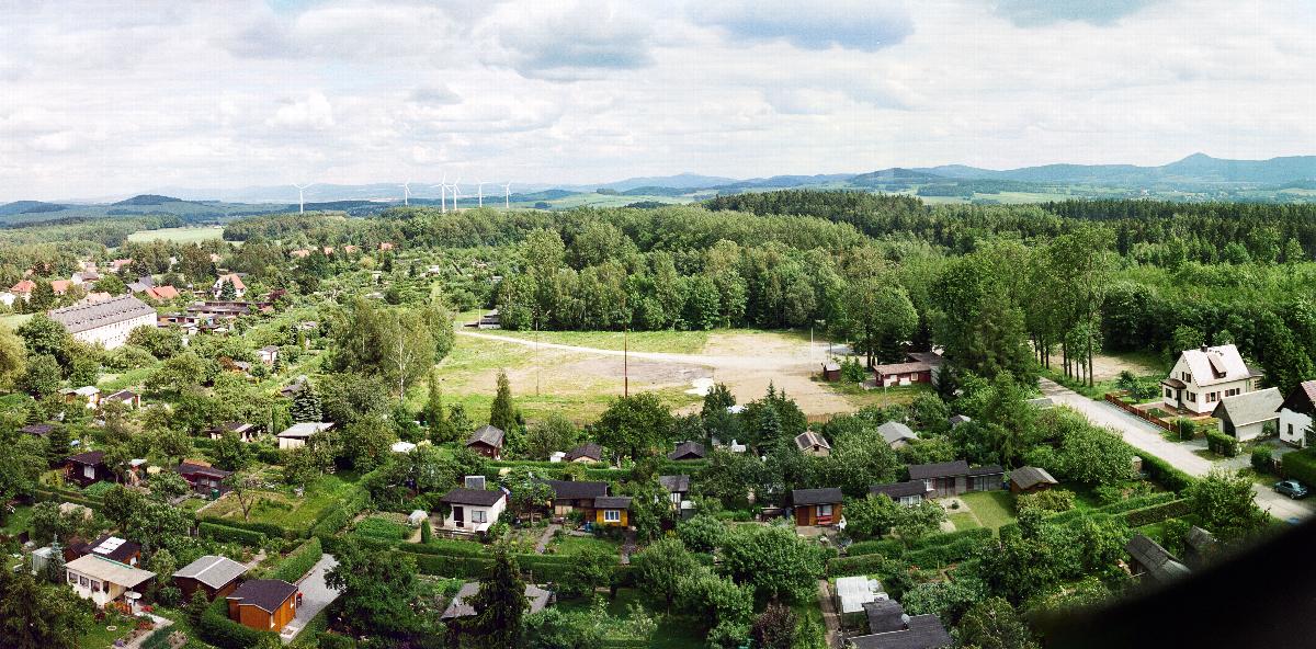 Panorama vom Wasserturm Neugersdorf anlässlich eines "Tages der offenen Tür" im Juni 2004, Blickrichtung: Riesengebirge mit Schneekoppe, Isergebirge mit Jeschken, Zittauer Gebirge mit Lausche