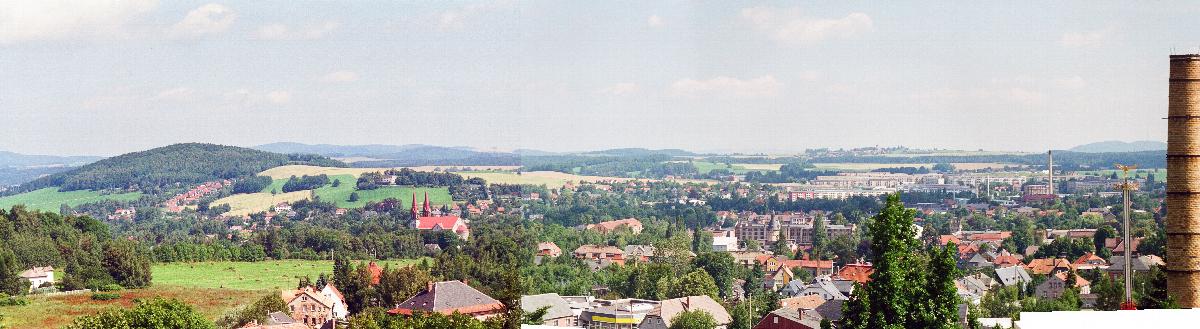 Blick vom Bismarkturm in Neugersdorf auf den Schlechteberg mit vorgelagerter August-Weise-Siedlung, der Phillipsdorfer Wallfahrtskirche/Tschechien, der Textilfirma "Lautex" Neugersdorf, Neubausiedlung "Ebersbach Oberland", dahinter Kottmarsdorf
