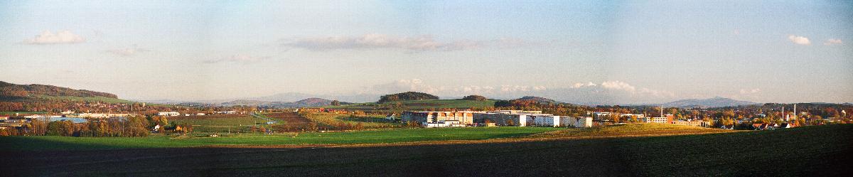 Blick vom Osthang des Schlechteberges auf das Neubaugebiet Ebersbach-Oberland (ab 1968) auf Kleinen und Großen Lerchenberg, auf das Isergebirge mit Jeschken (rechts)