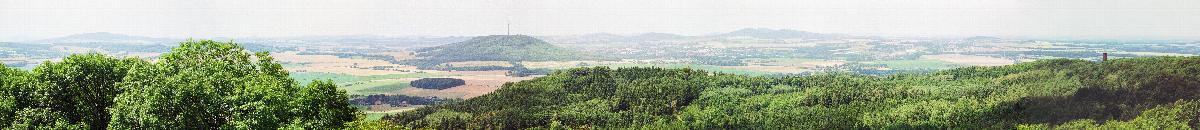 Blick vom Rotstein (Turm) auf Löbau mit Löbauer Berg/auf das Lausitzer Bergland (im Dunst)