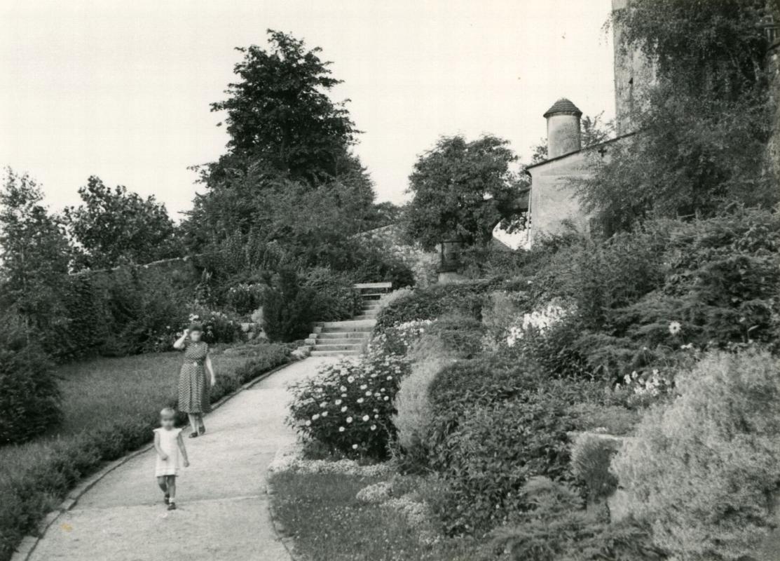 Gartenanlage an einer Mauer mit Tordurchgang und Türmchen