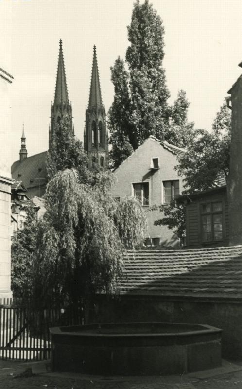 Stadtansicht mit Brunnen Häusern und Kirche, dazwischen einzelne Bäume