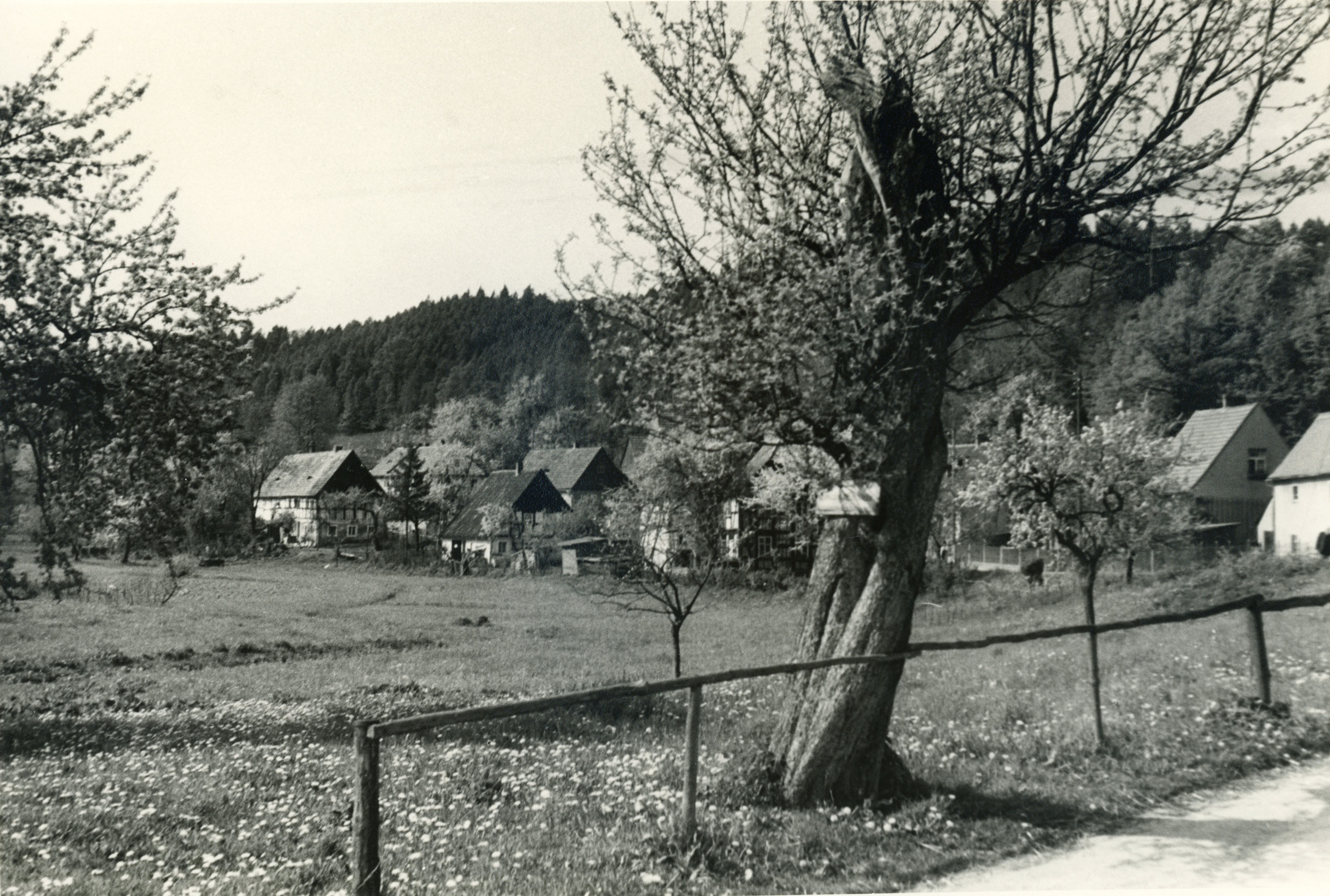 Blick von Weg am Feld mit einzelnen Bäumen auf Ortschaft, dahinter Wald