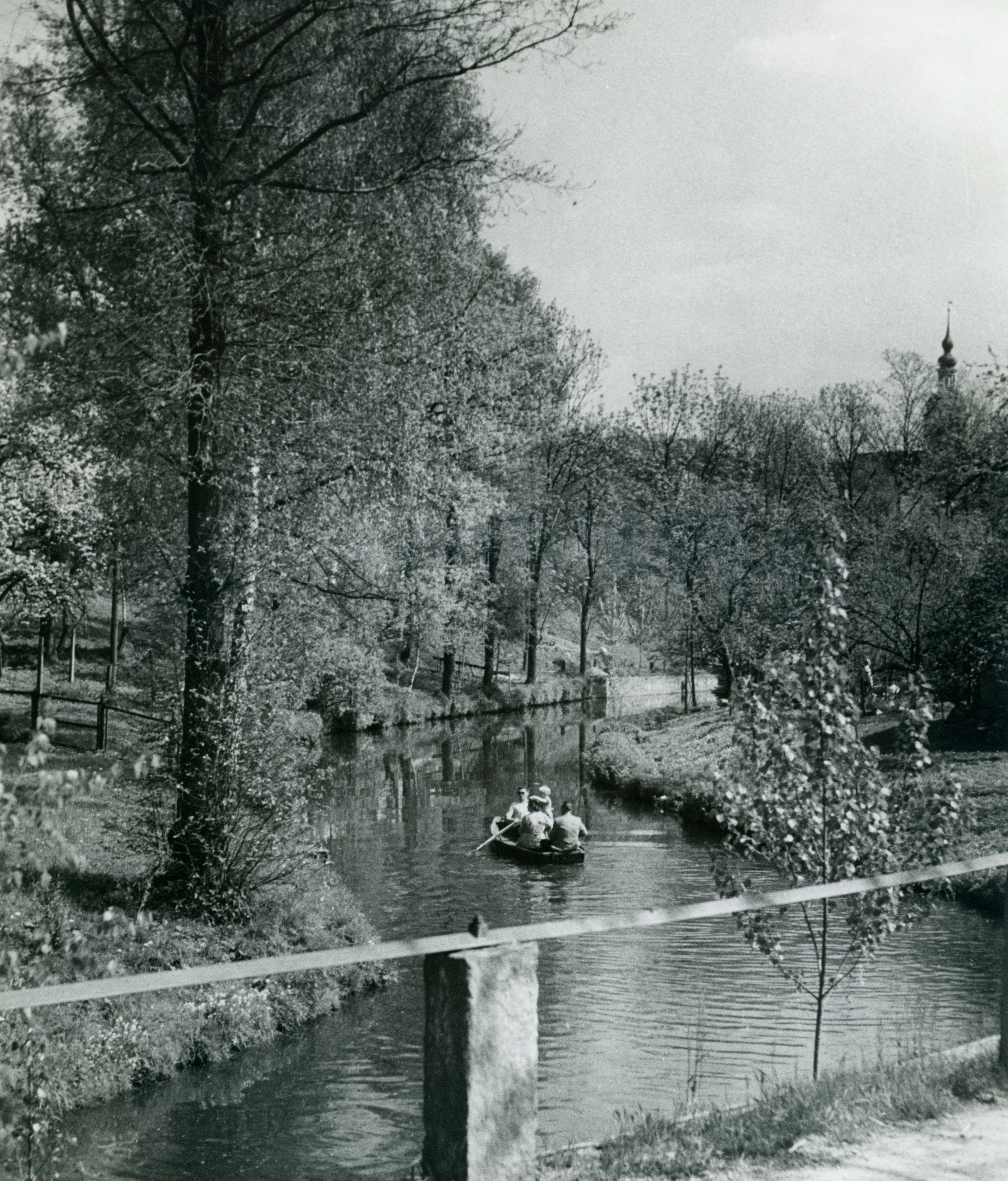 Fahrt mit dem Ruderboot auf einem von Bäumen gesäumten Fluss, im Hintergrund eine Kirche