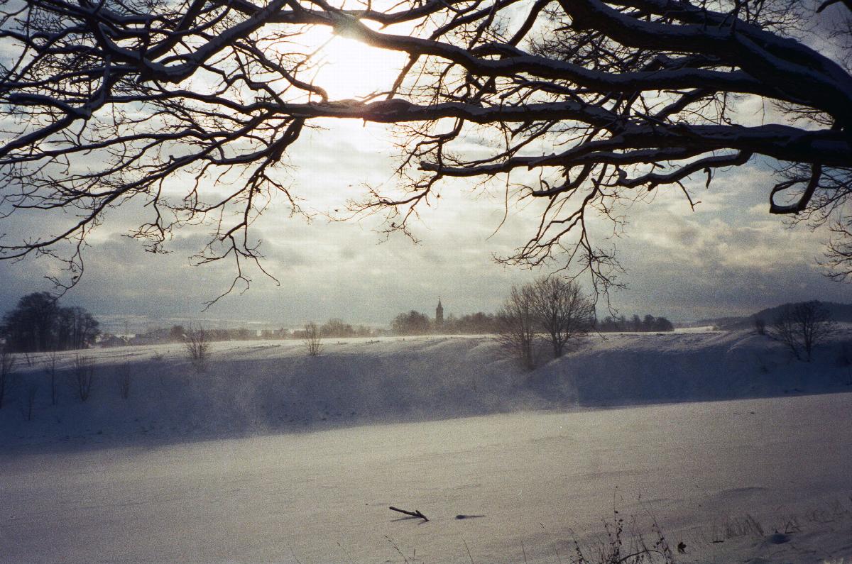 Astwerk eines Baumes am Rand eines verschneiten Feldes, im Hintergrund, hinter einer Böschung, eine Ortschaft mit Kirche