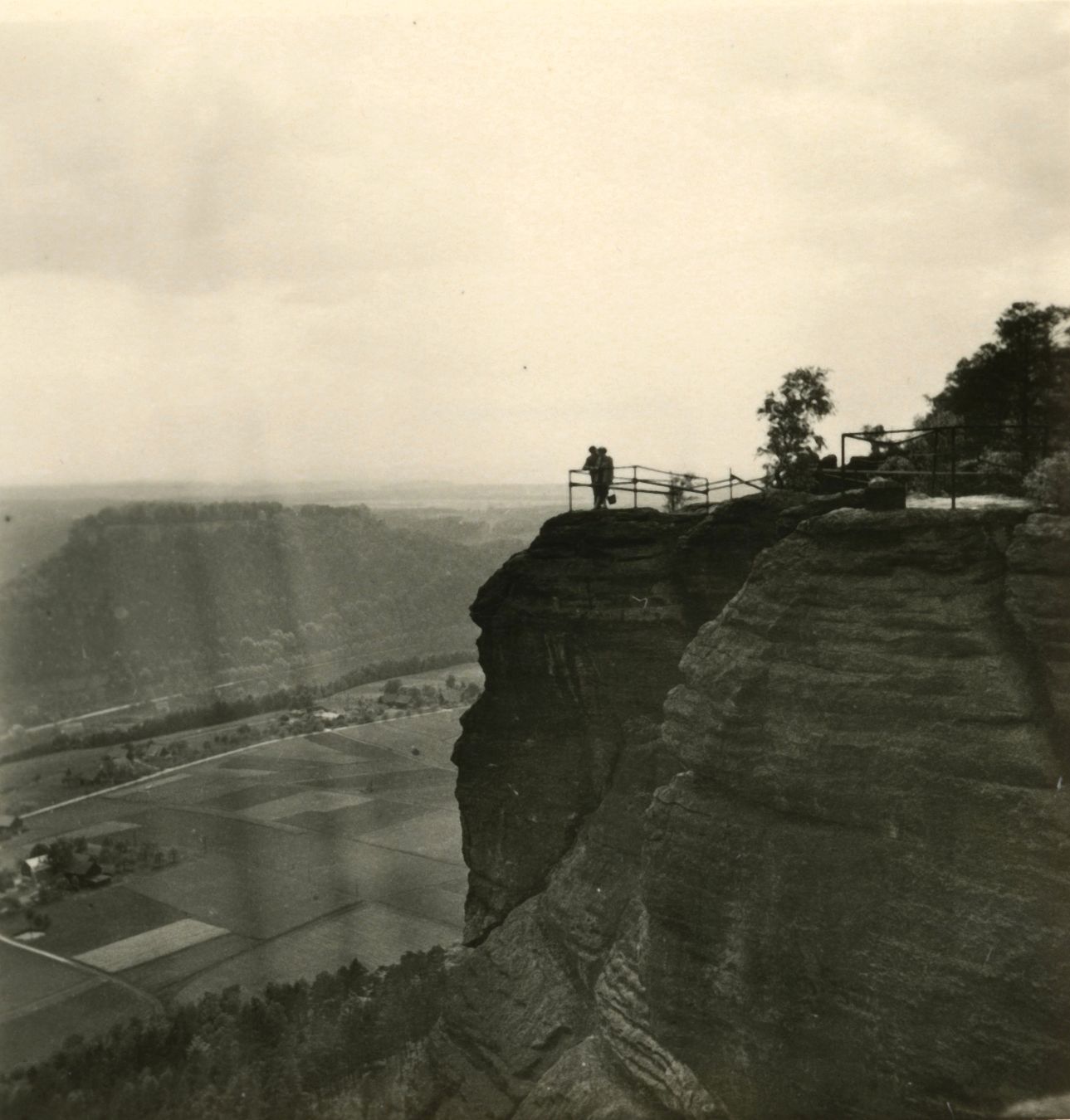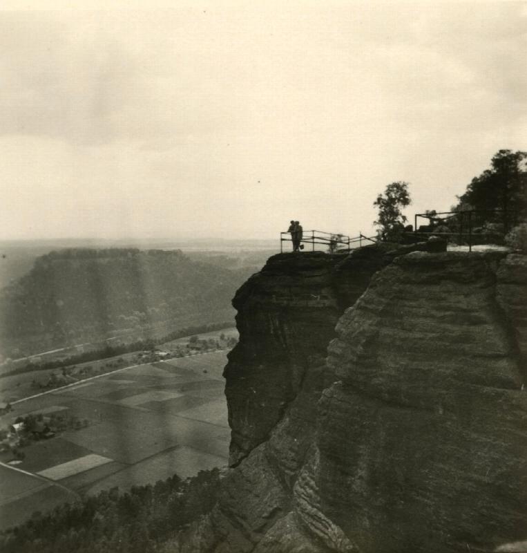 Lilienstein. Blick grob nach Südwesten. Der Berg im Hintergrund ist die Festung Königstein. ursprüngl. Beschreibung: mittlerweile gesperrte "Kanzel" auf der Bastei im Elbsandsteingebirge