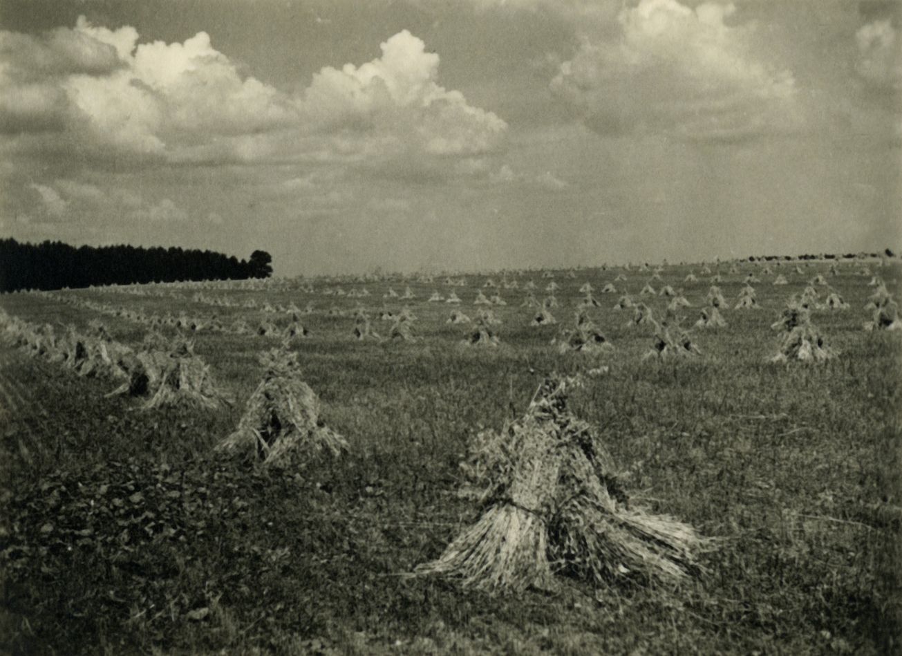bei Charlottenhof, Erntezeit, Feld mit gebündelten Weizengarben