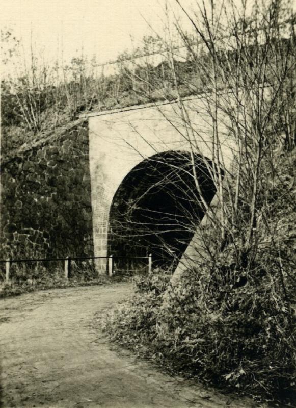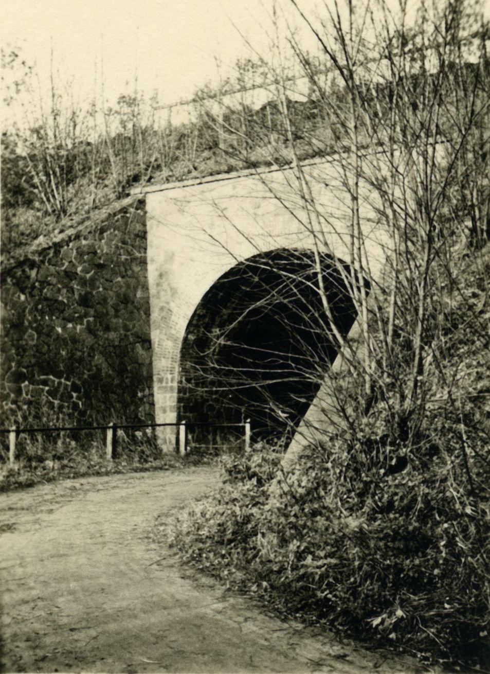 Weg führt durch Unterführung, kahle Büsche links und rechts