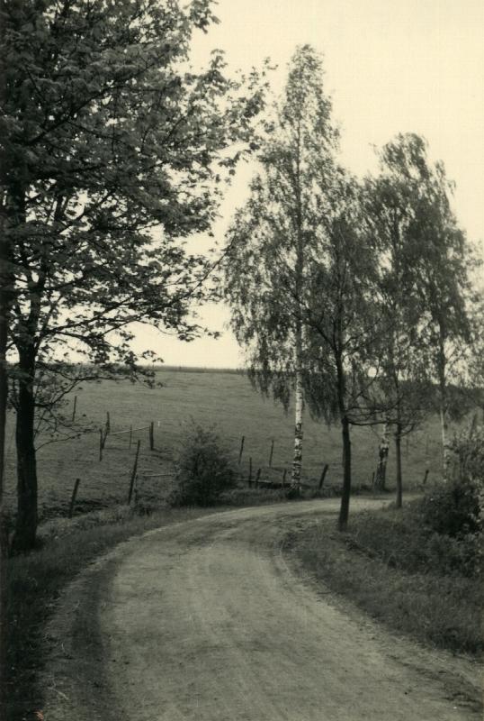 Weg entlang eines Feldes, am Rand stehen einzelne Bäume