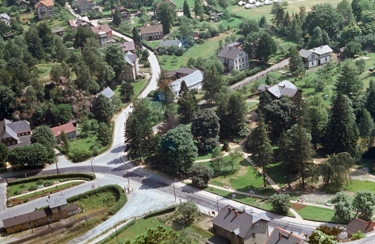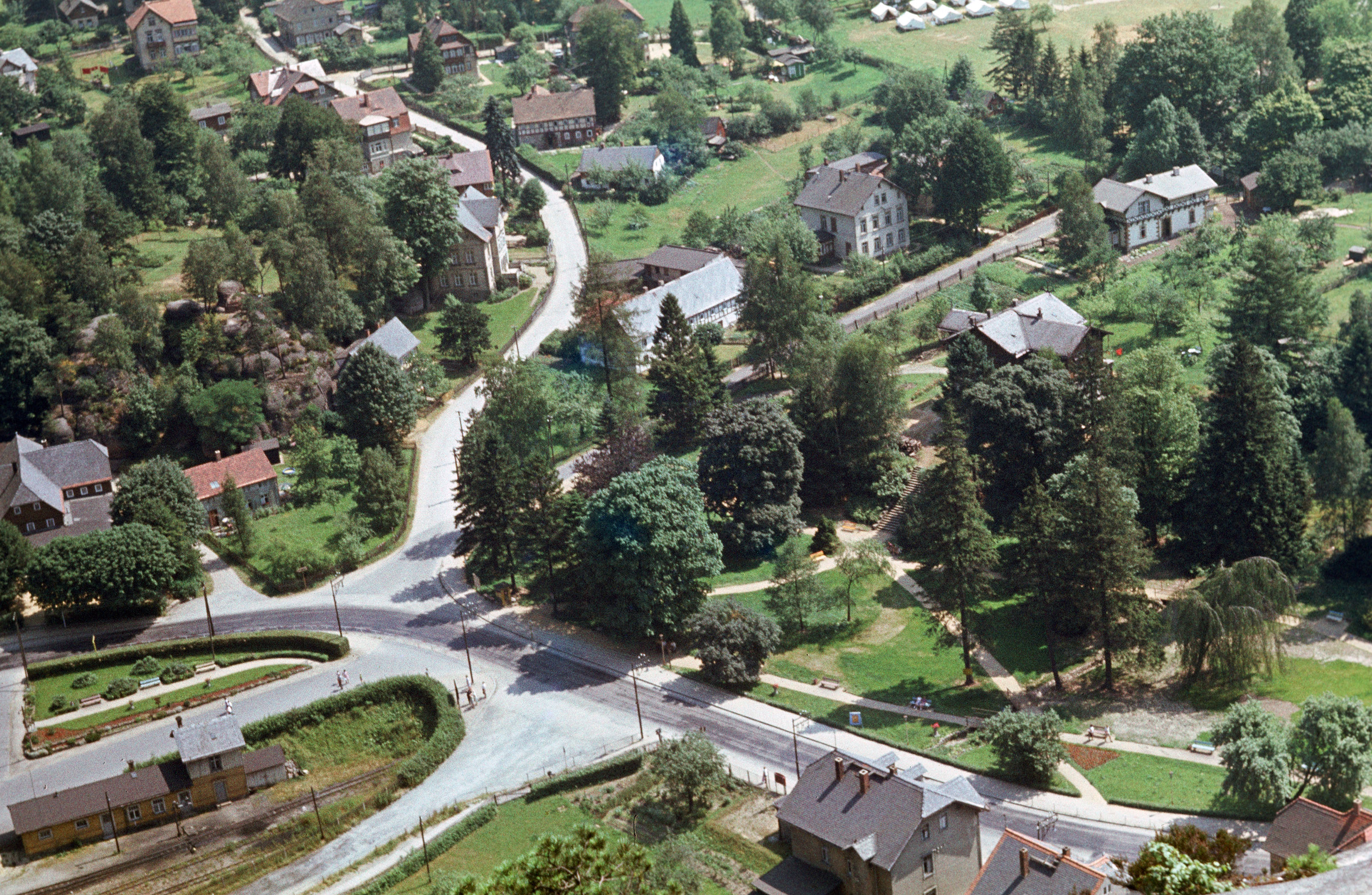 Blick von Oben auf die Straßen und Häusern von Oybin/Hain