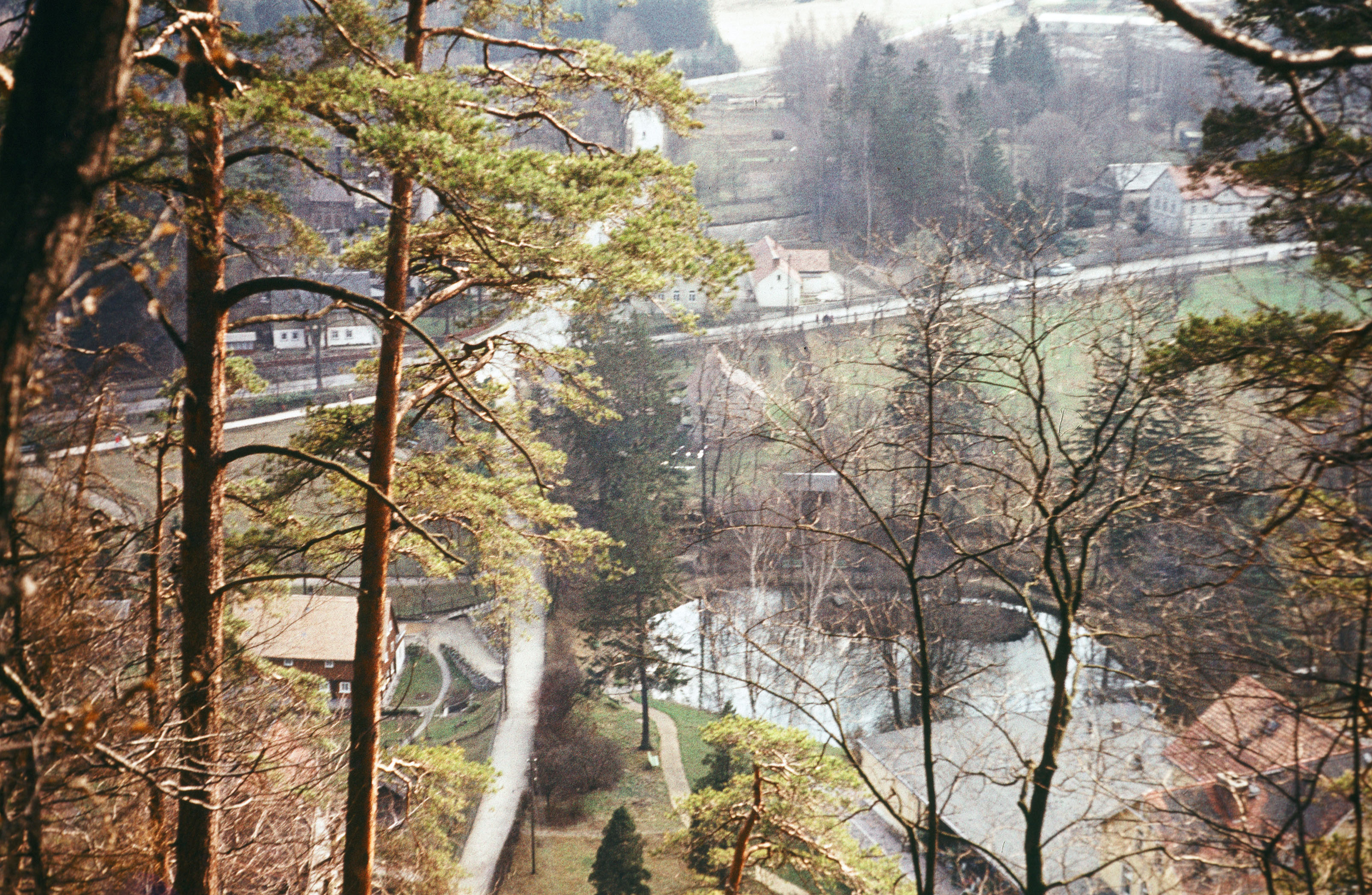 Blick von Oben durch Bäume auf einer Kreuzung in Oybin/Hain