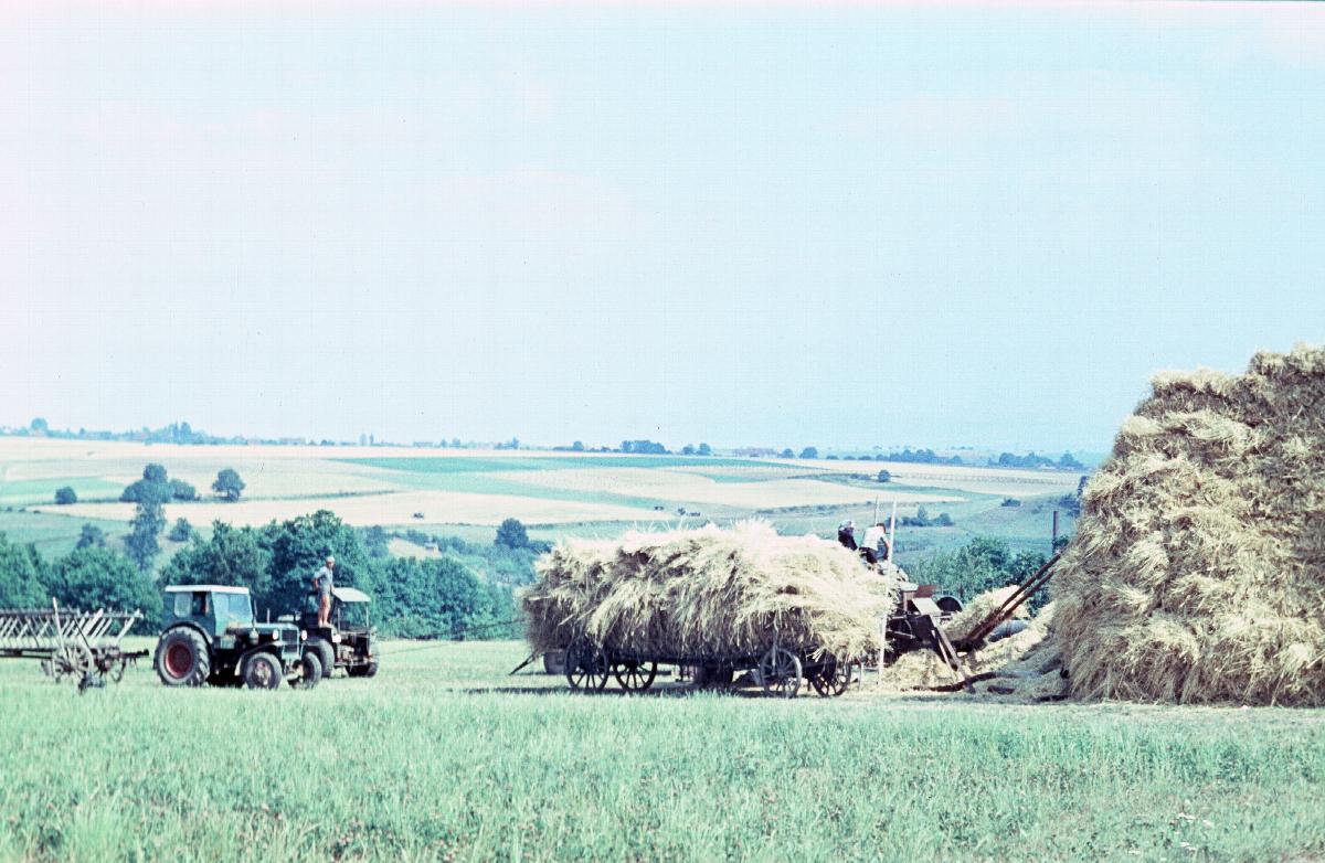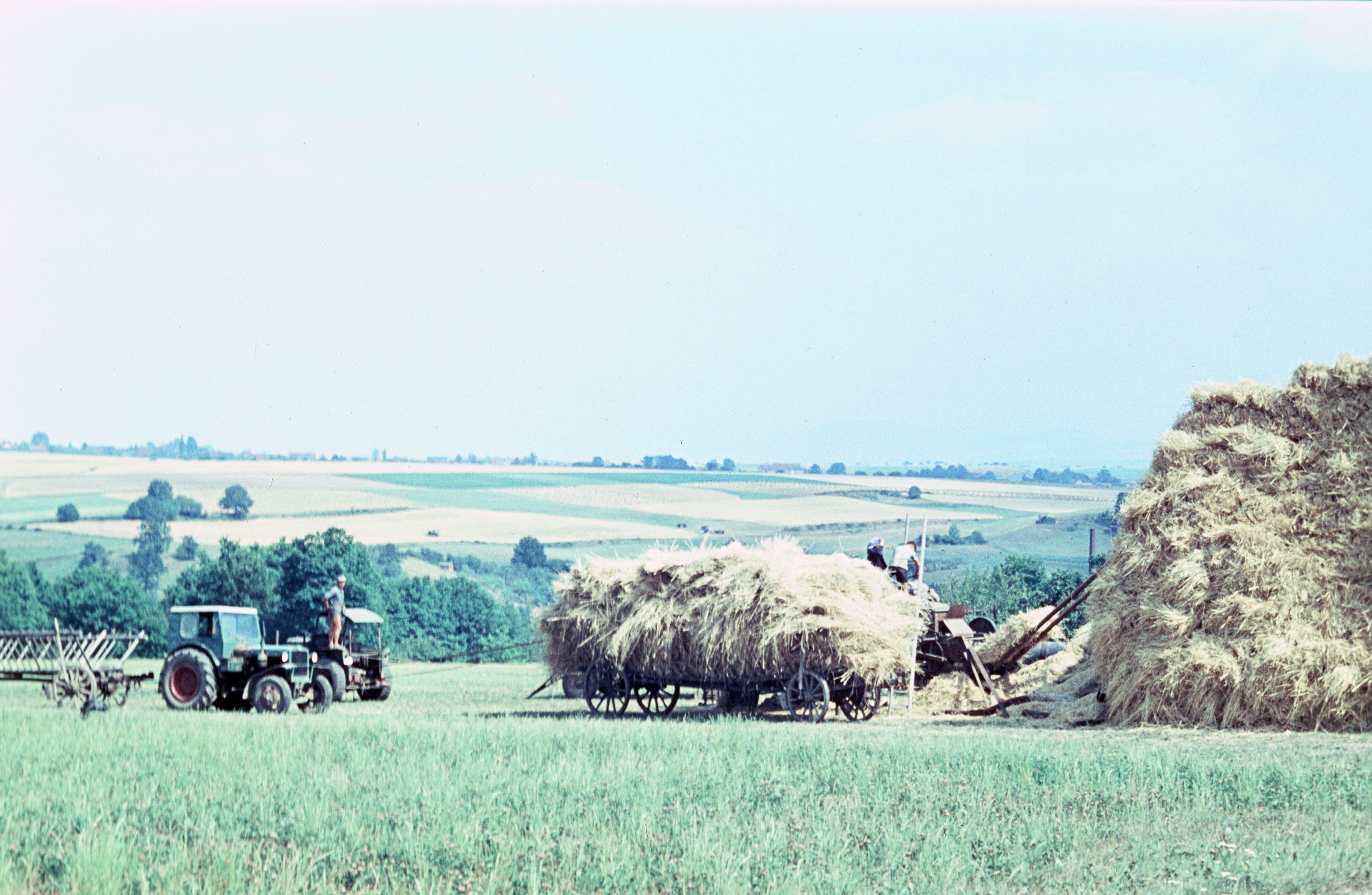 Feld während der Ernte mit Arbeiter, Wagen und Traktor