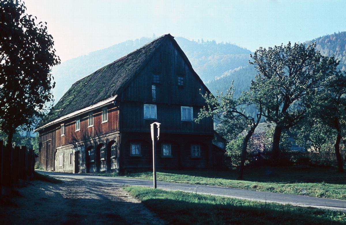 Umgebindehaus mit Obstbäumen, Hauptstraße, Lausche im Hintergrund
