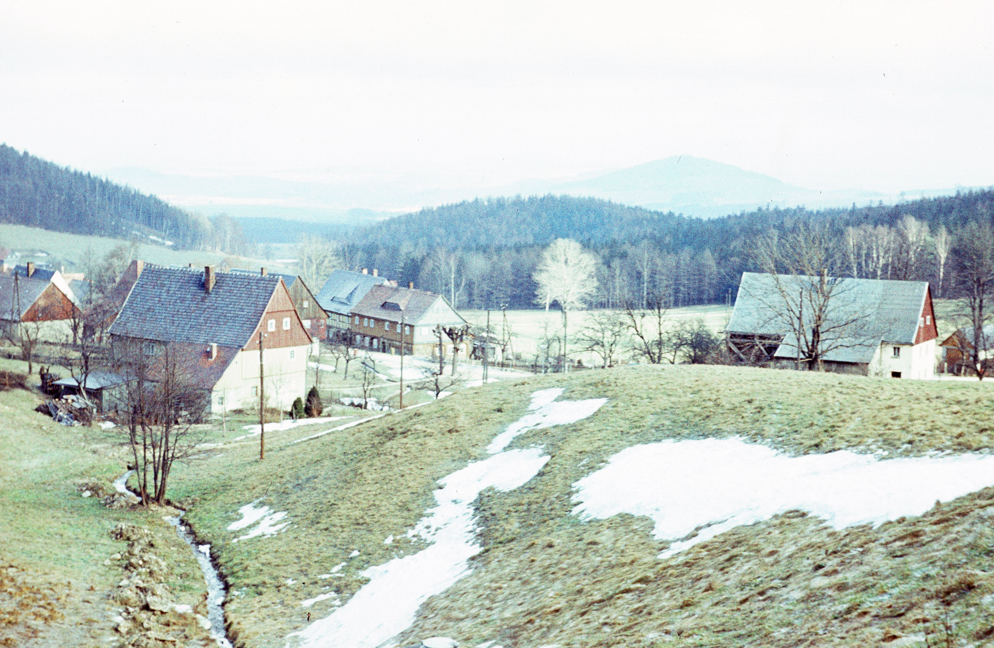 Häuser und ein Bach im Schnee, Wald im Hintergrund