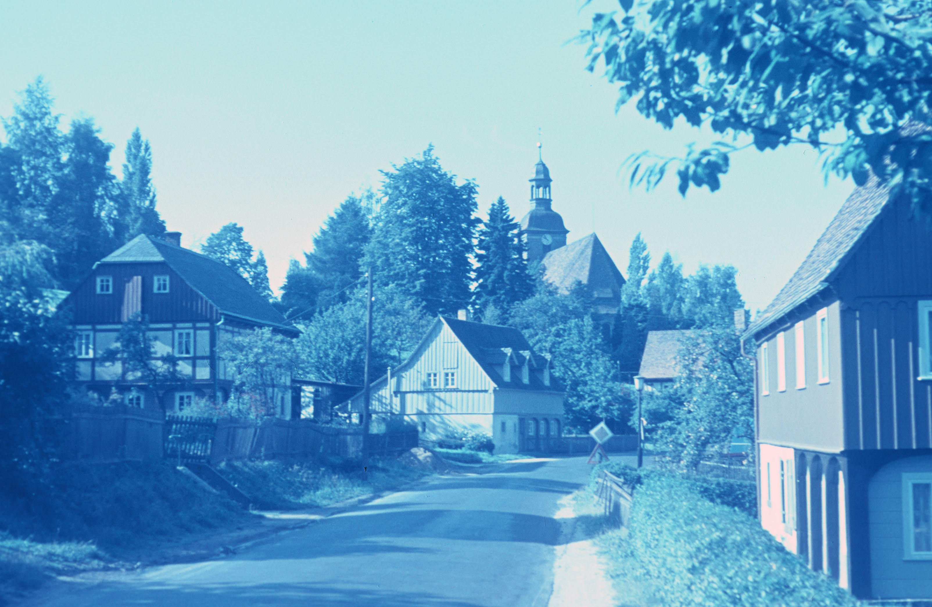 Straße in Lückendorf, Dorfkirche im Hintergrund