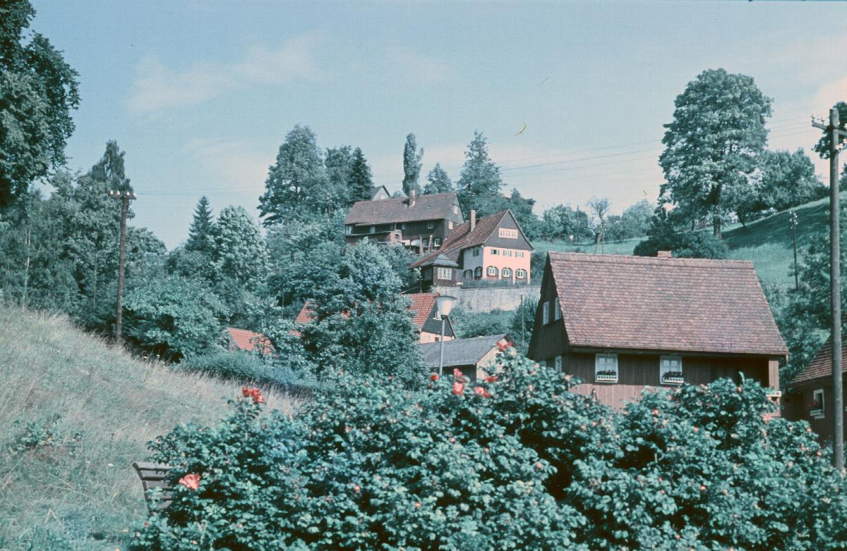 Blick durch Bäume auf Umgebindehäuser