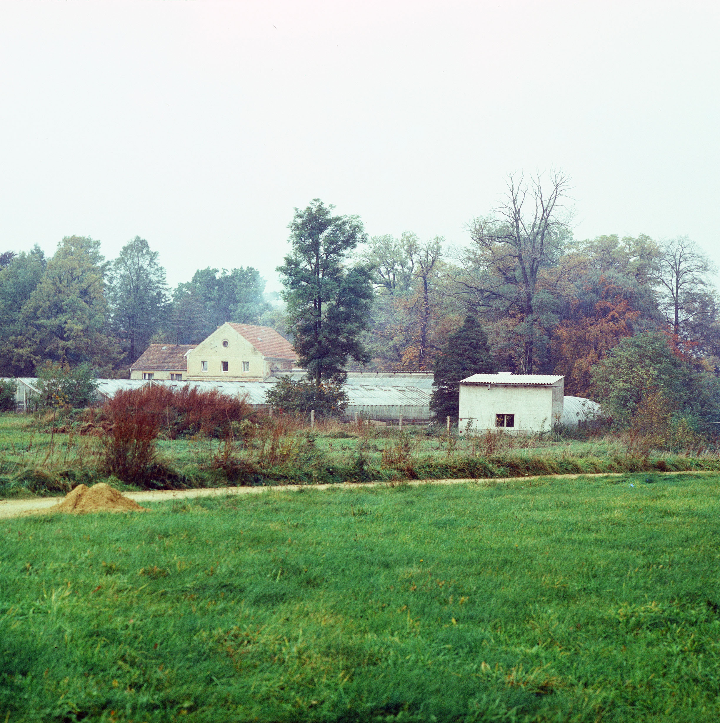 Blick auf Bäume und Gewächshaus hinter einer Straße
