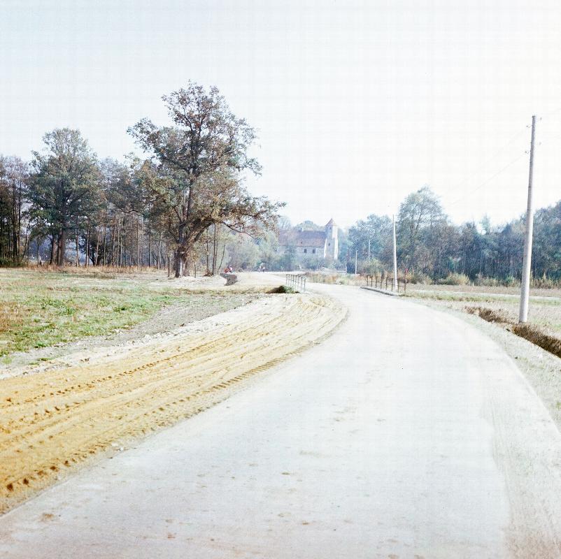Straße durch Felder, Gebäude und Bäume im Hintergrund