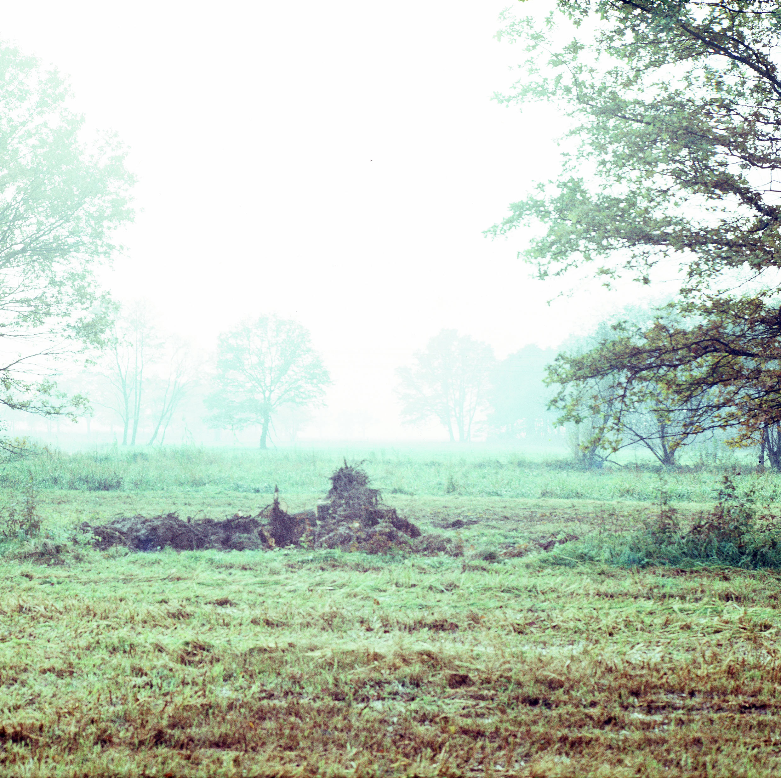 Feld, im Hintergrund Bäume im Nebel