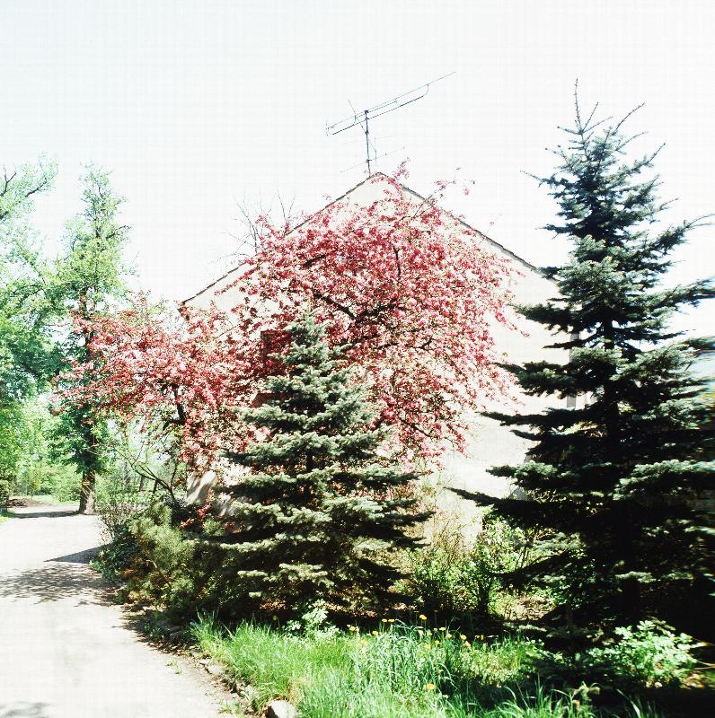 Straße und Haus, Kirschbaum im Vordergrund