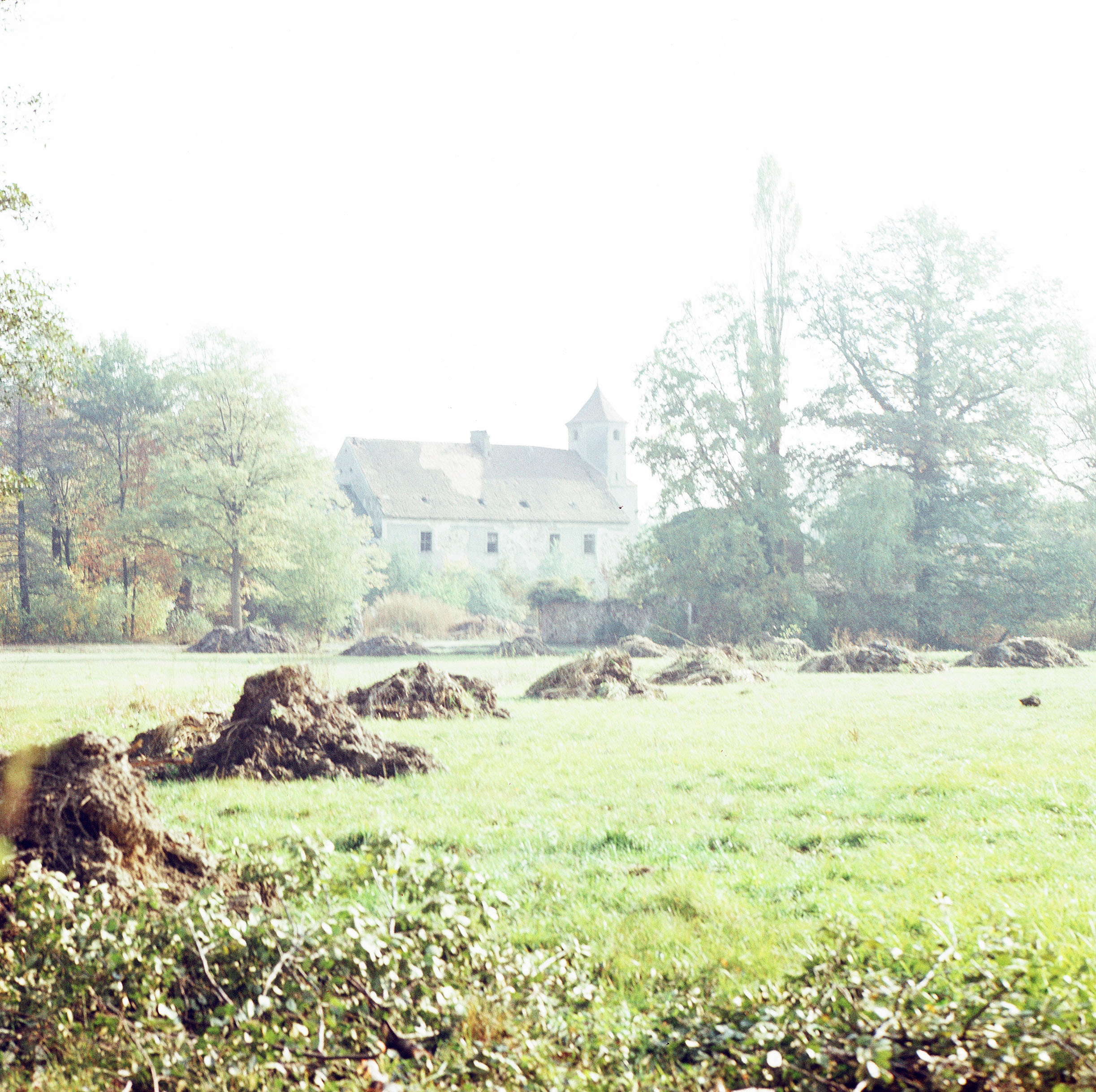 Wiese, im Hintergrund Bäume und Gebäude (vielleicht eine Kirche)