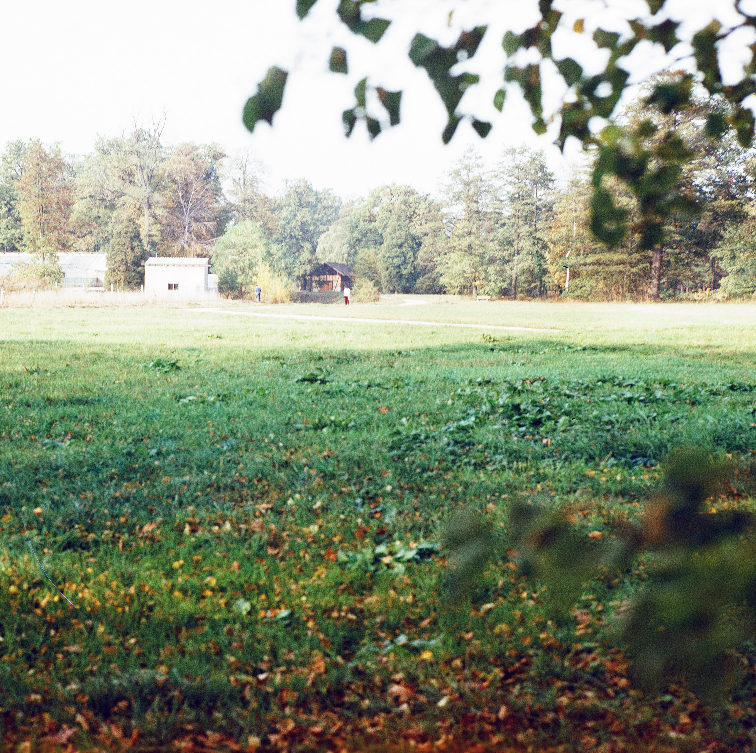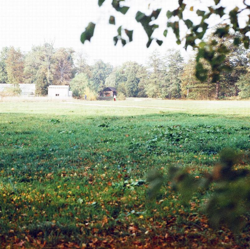 Blick auf einer Wiese mit Gebäuden im Hintergrund