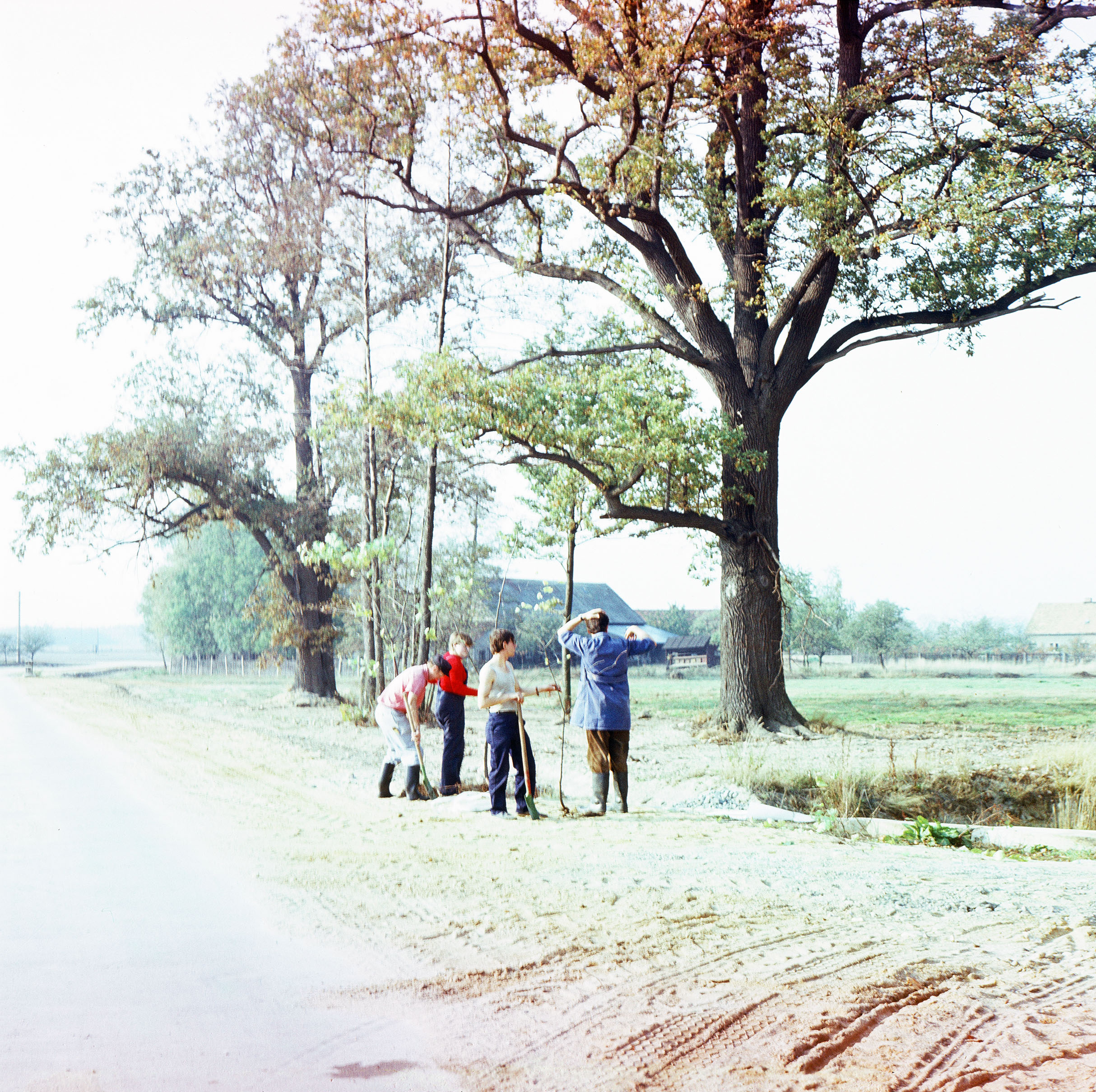 Arbeit auf dem Feld an einem Graben unter großen Bäumen, im Hintergrund ein großes Gebäude