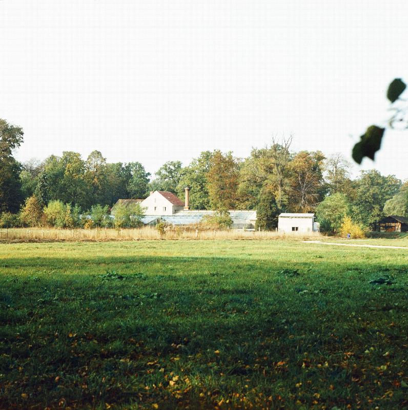 Blick über Wiese auf Gebäuden