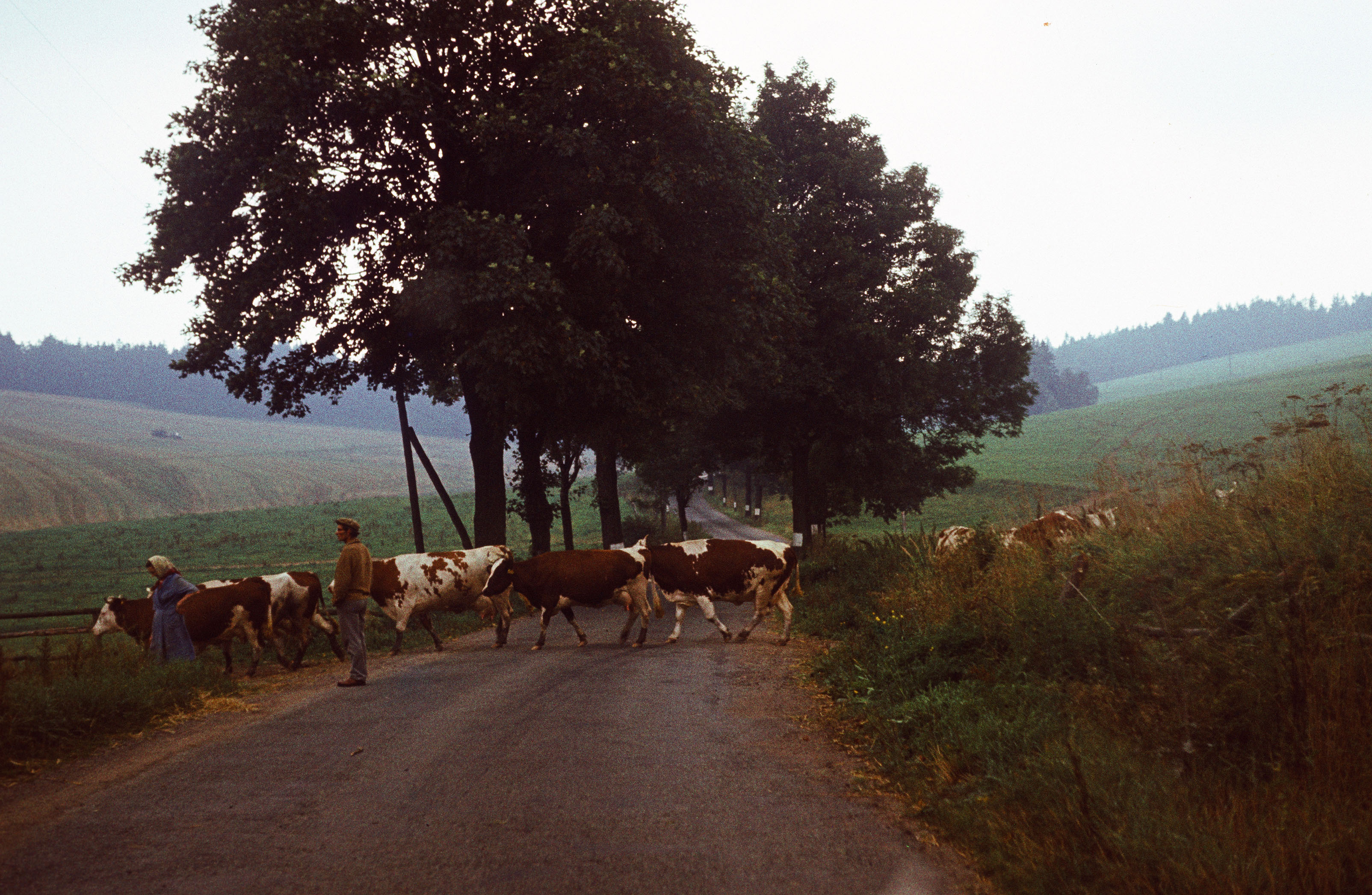 Kühe überqueren eine Straße zwischen zwei Feldern