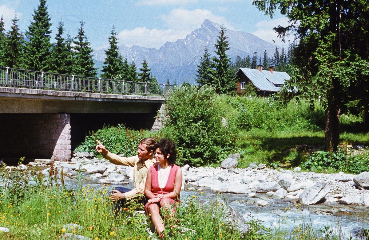 Bach und Brücke vor Wäldern und Gipfel des Krivans