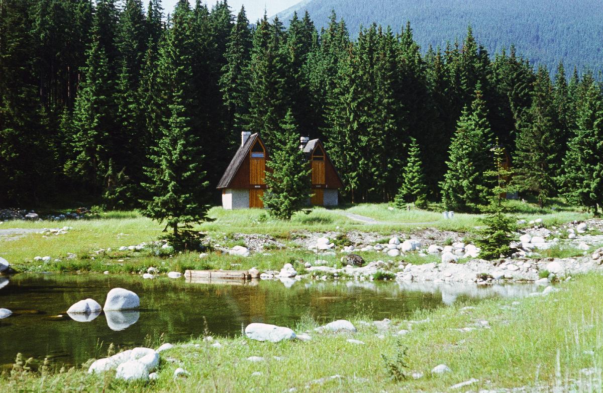 Hütten neben einem Teich und Wald
