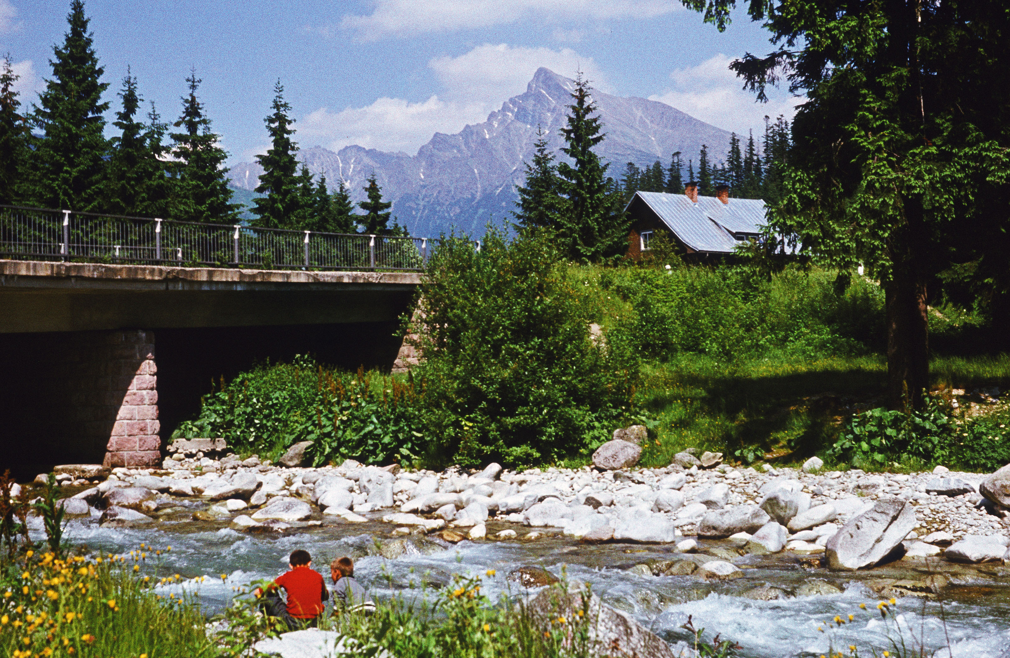 Haus, Bäume und ein Fluss vor dem Gipfel des Kriváns
