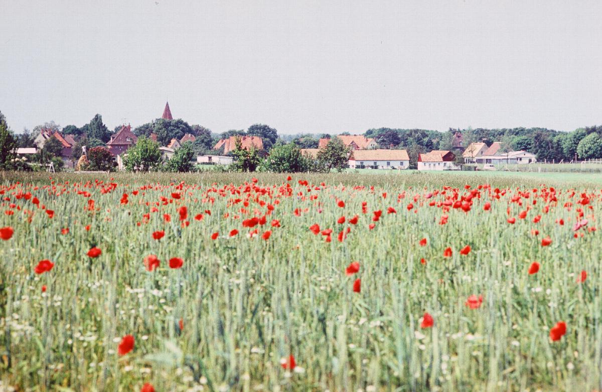 Mohnblumen auf einem Feld vor einer Ortschaft