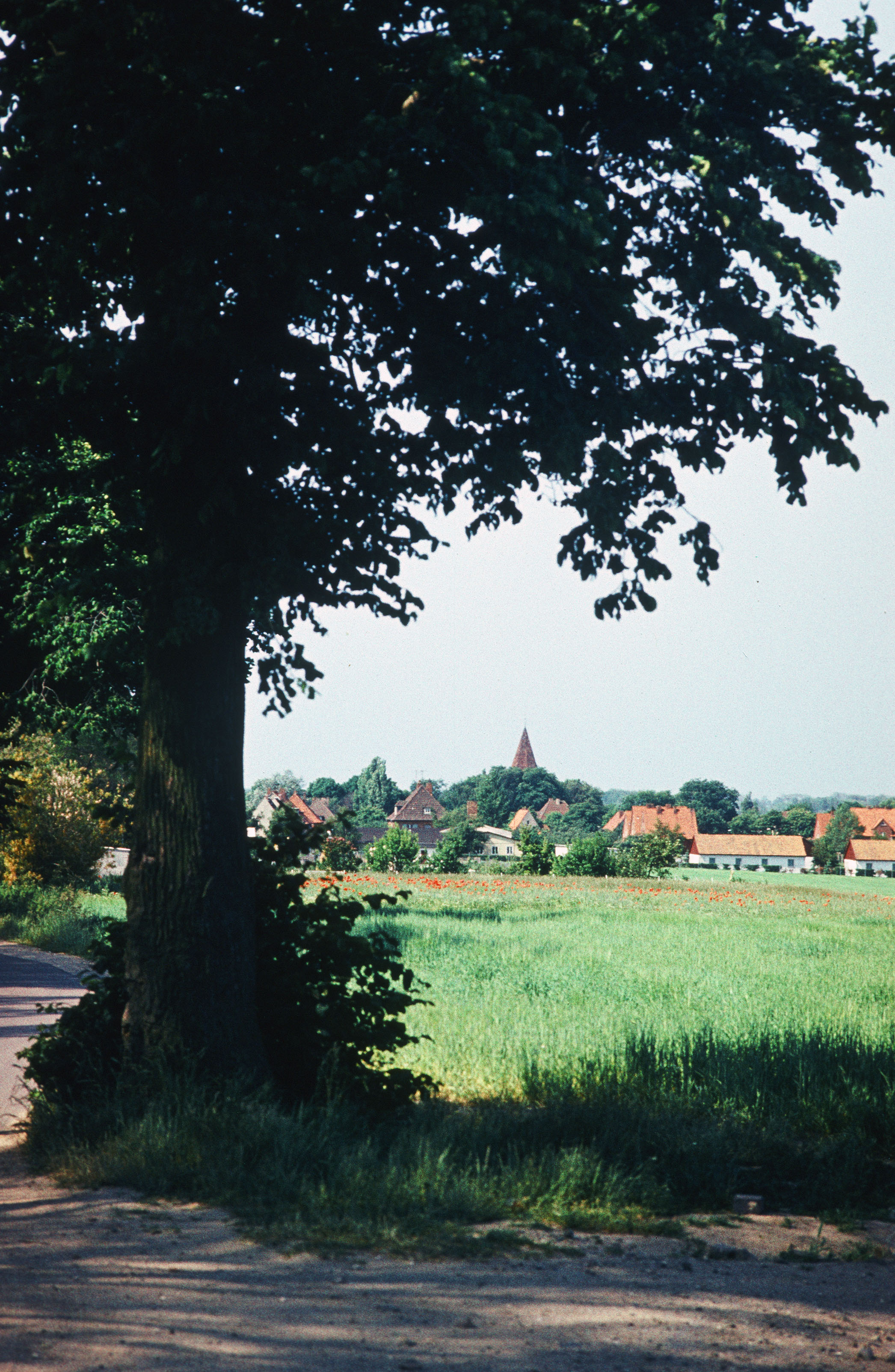 Straße unter Bäumen vor einem Feld und Ortschaft