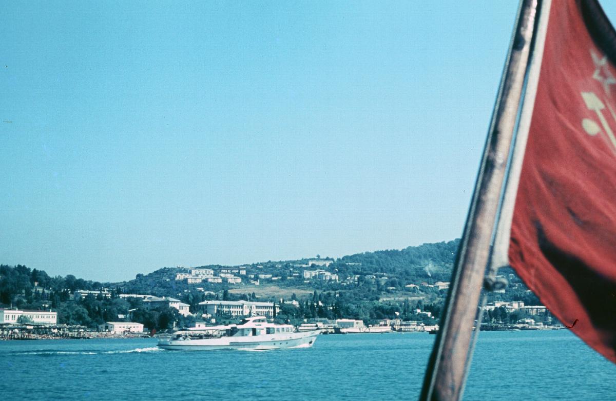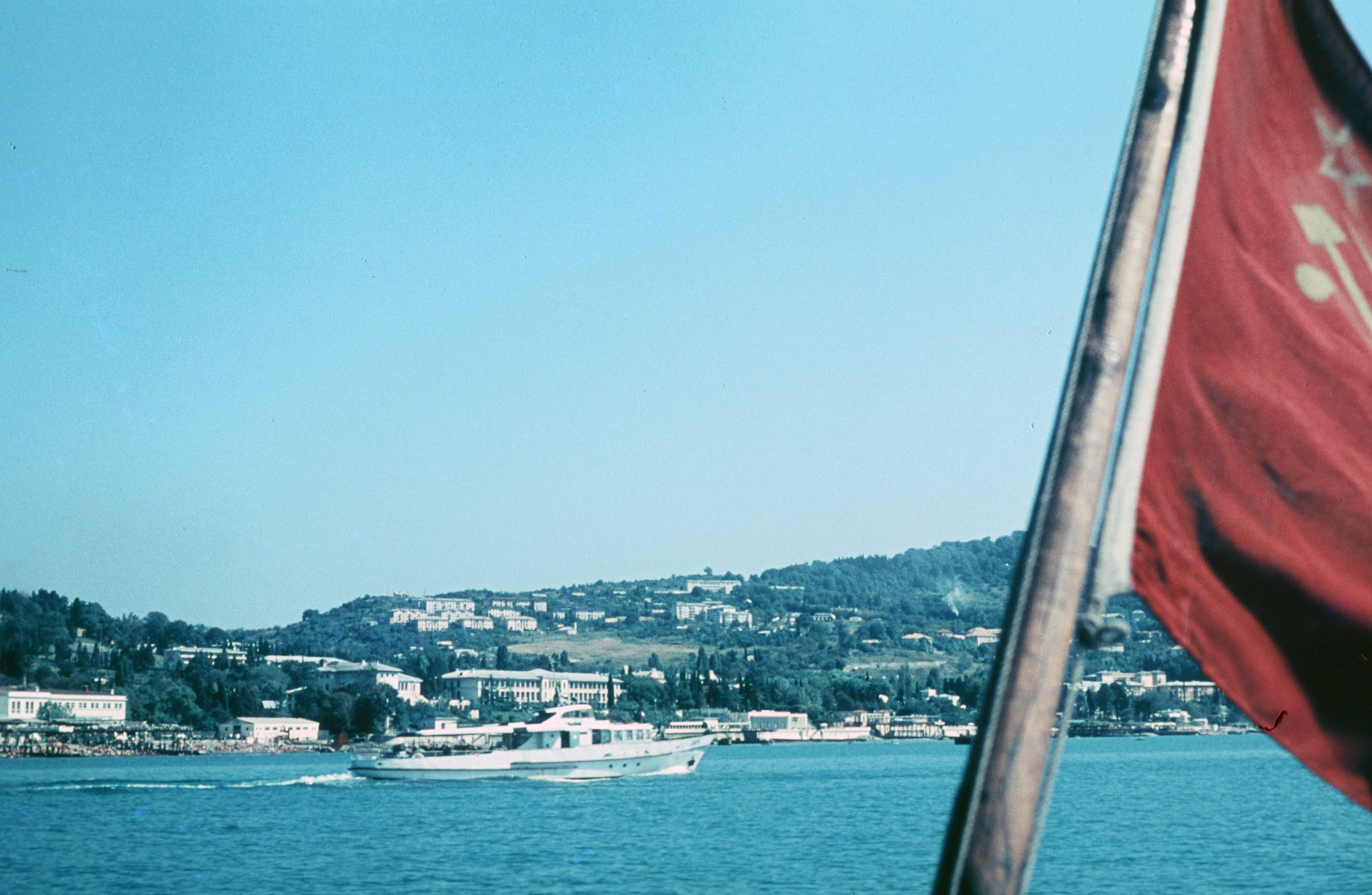Häuse am See mit Sowjetischer Flagge im Vordergrund