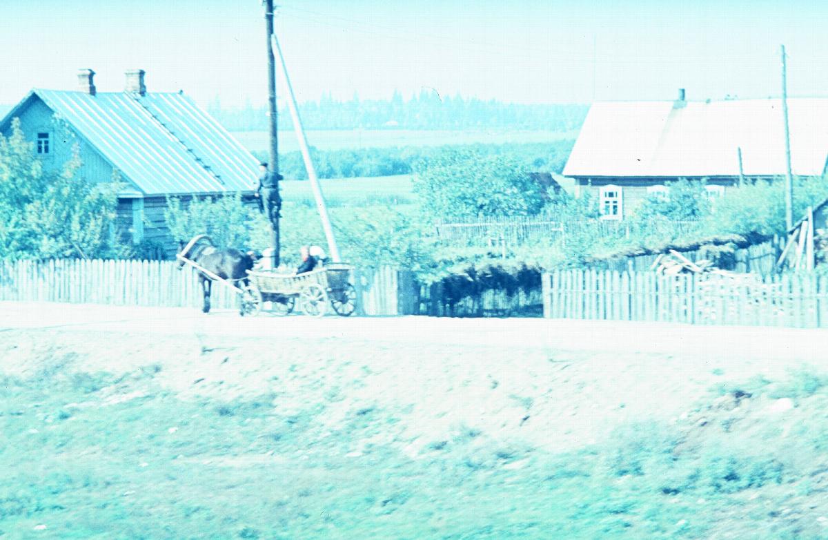 Häuser am Feld mit einem Pferd und einer alten Kutsche