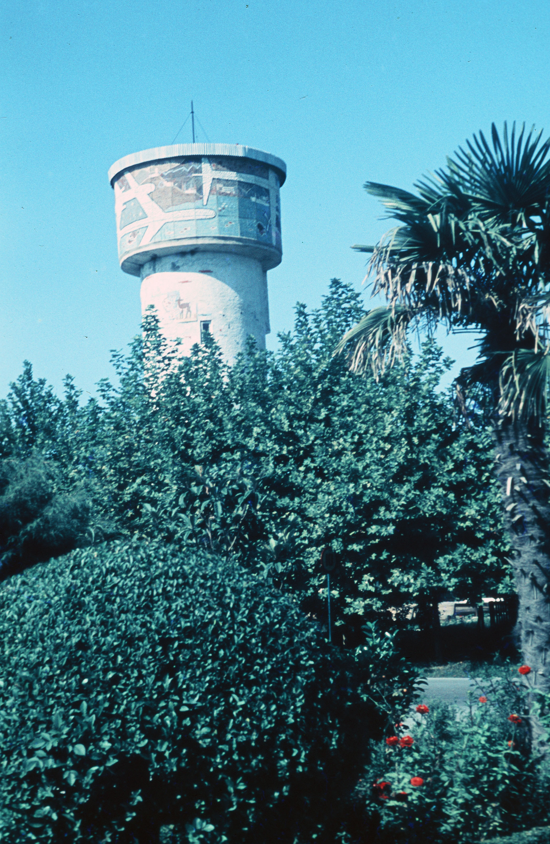 Turm mit Flugzeug Mosaik/Gemälde hinter Bäumen