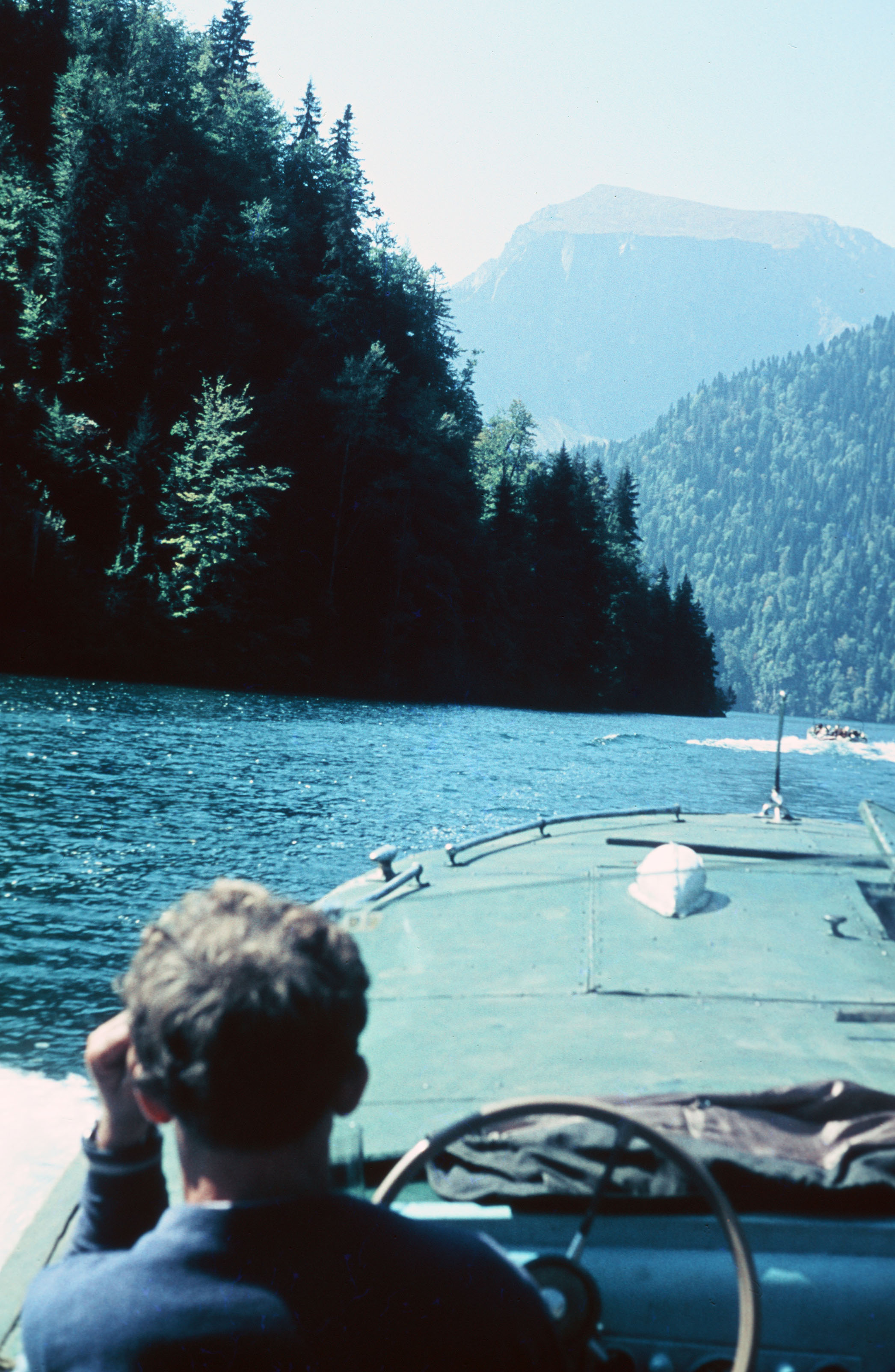 Boot auf Wasser zwischen Bergen mit dicht wachsenden Wäldern