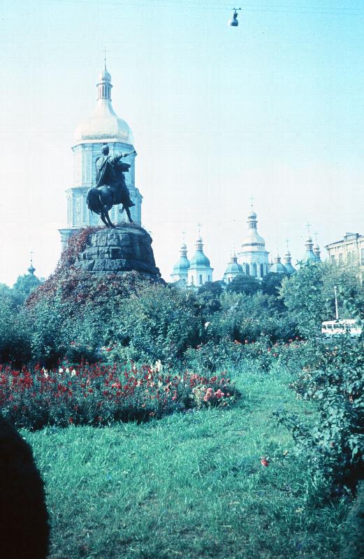 Pferdestatue in einem Park vor verschiedenen Türmen