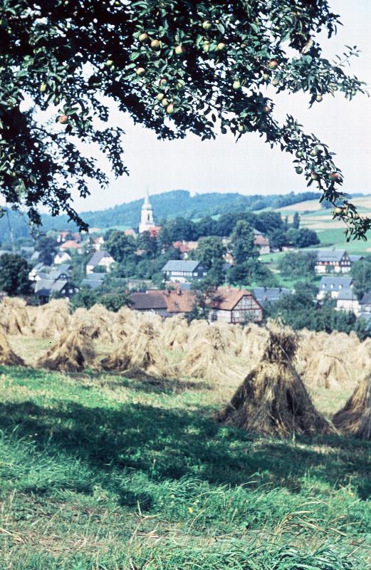 Blick über Heustapeln auf eine Kirche und Ortschaft
