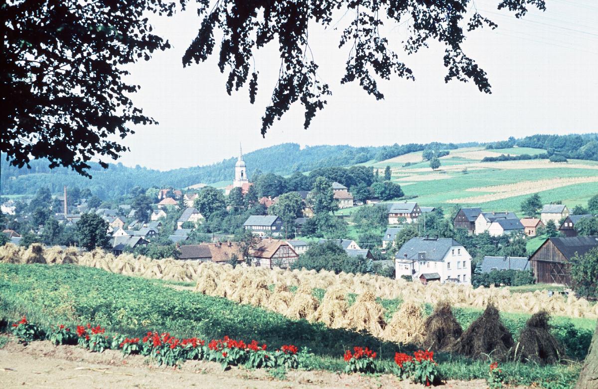 Blick über Heustapeln auf eine Kirche und Ortschaft
