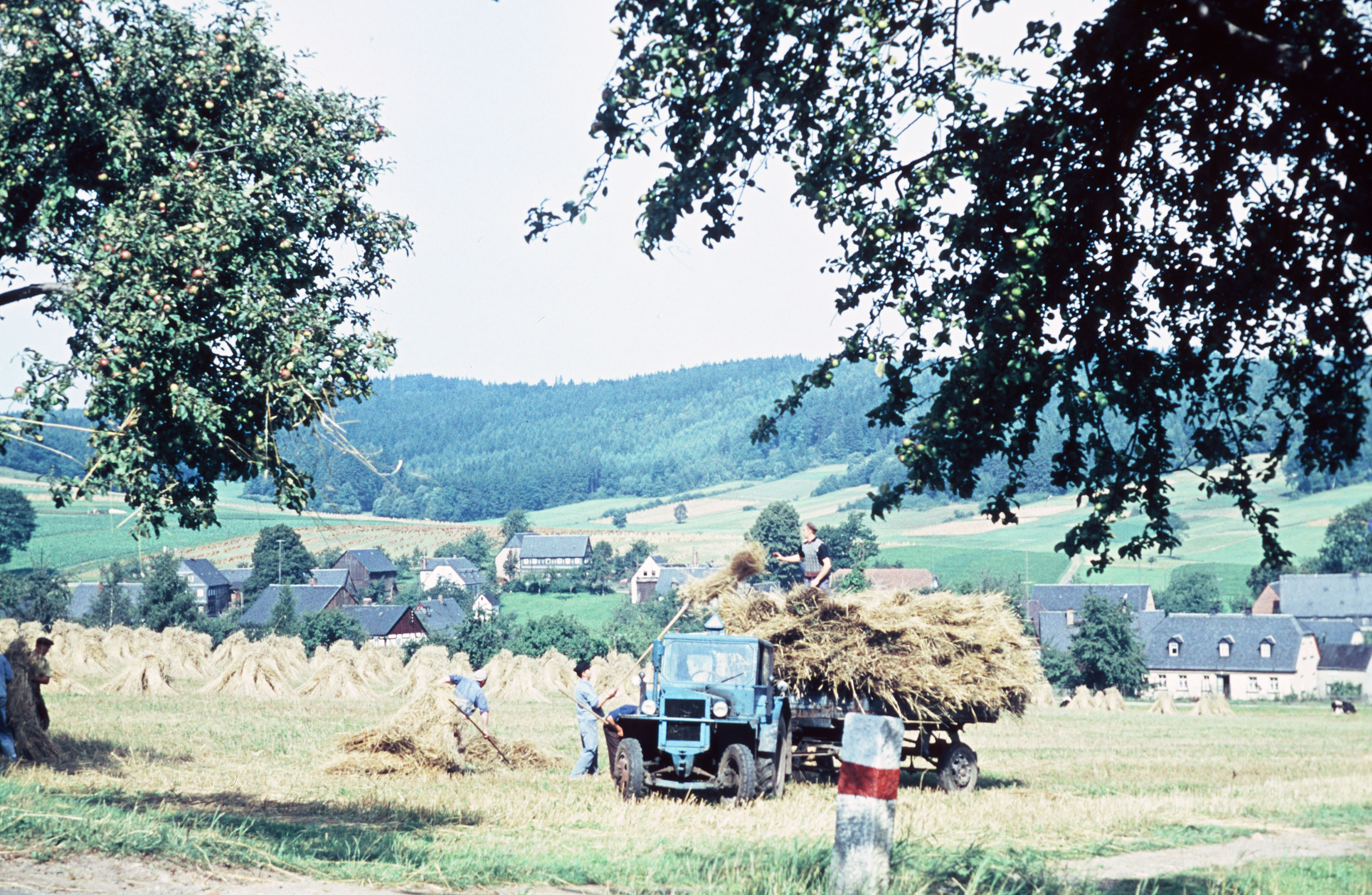 Blick über Felder und Häuser während der Ernte
