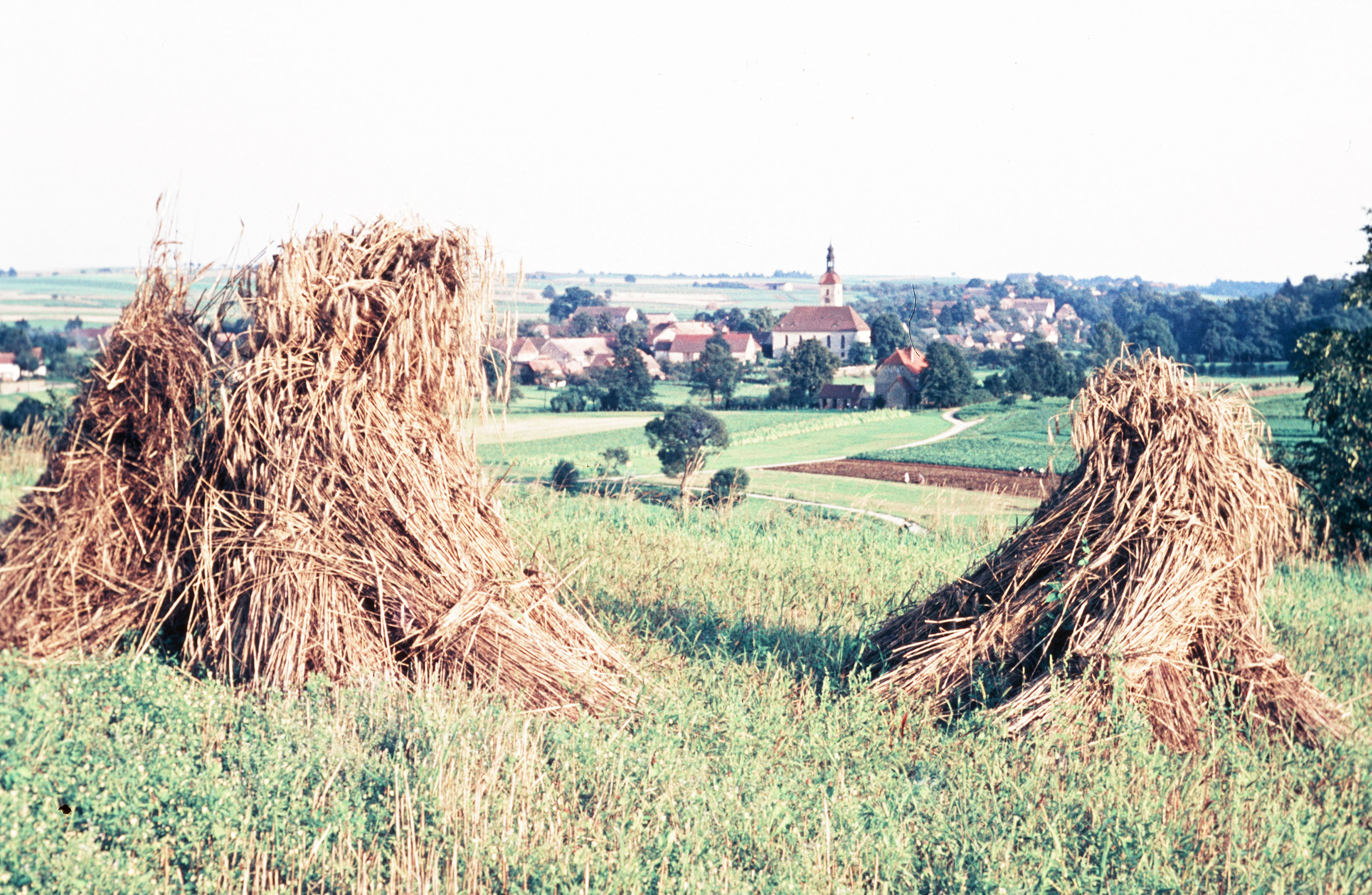 Blick zwischen Heuhaufen über Felder, Kirche und Ortschaft