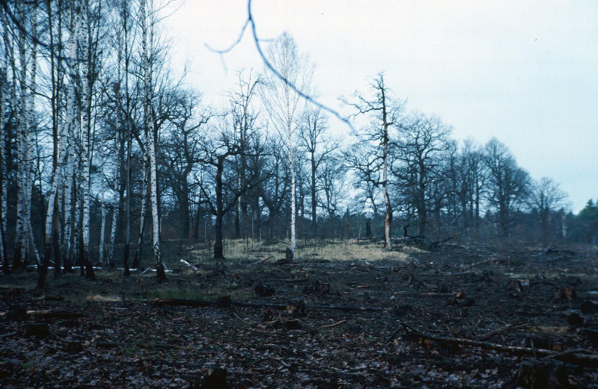 Baumstämme und abgebrannter Waldboden, nach Waldbrand