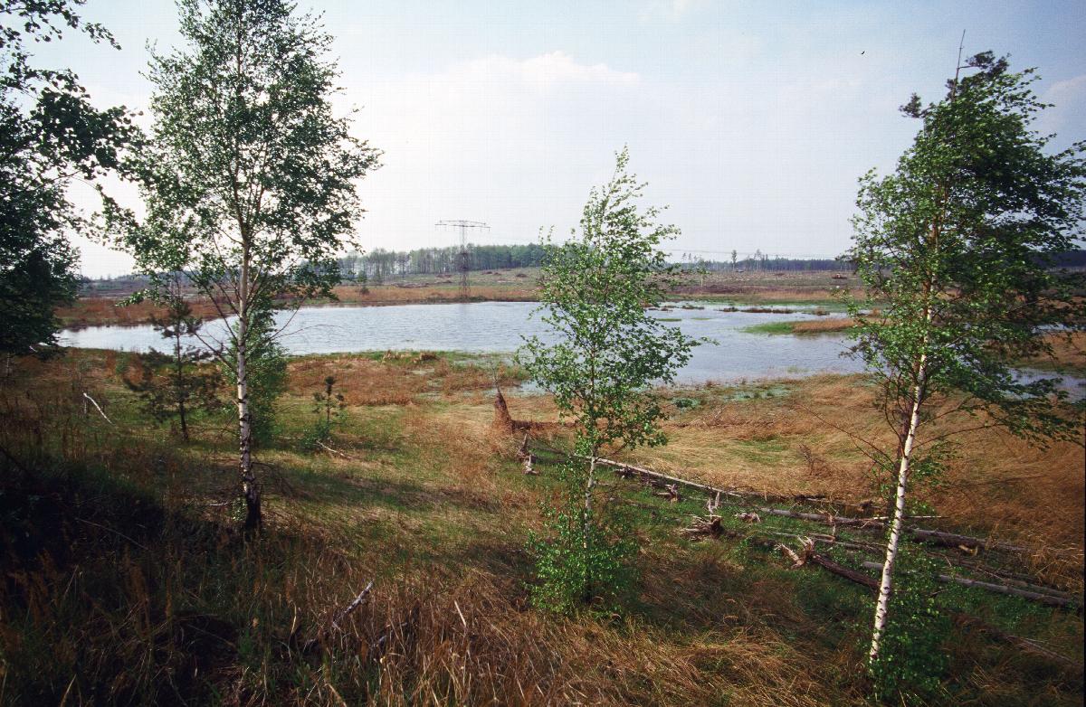 Birken und Felder vor einem See