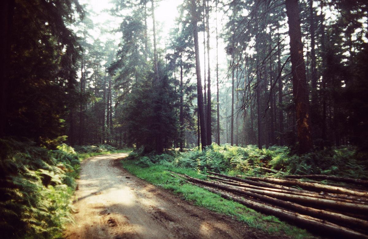 Weg durch Urwald Weißwasser mit Farnen und gefällten Bäumen am Rande
