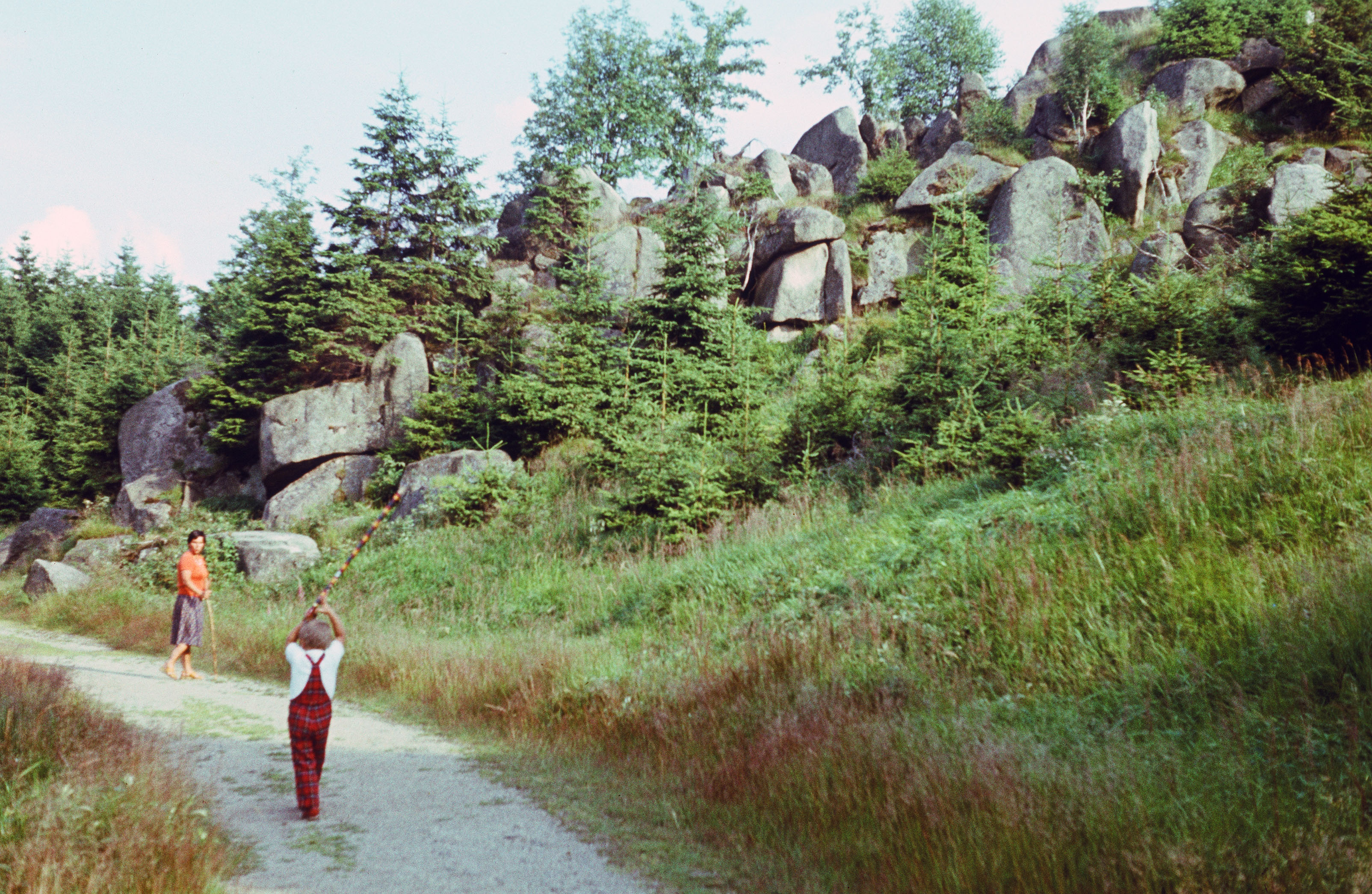 Wanderweg, Wiese, Sandsteinfelsen zwischen denen Tannen wachsen