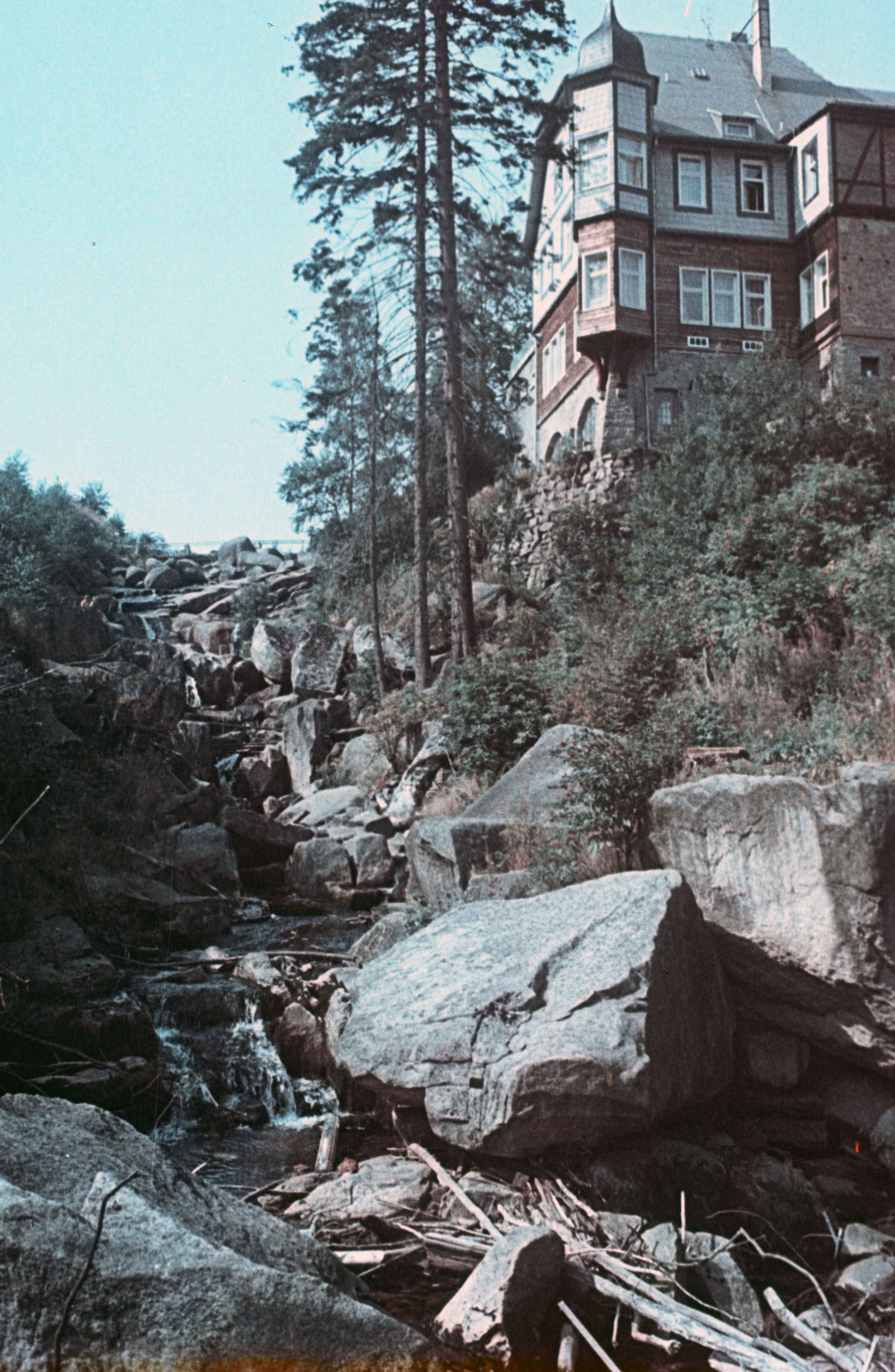 Haus an steil abfallendem Bach, über den Bach führende Brücke