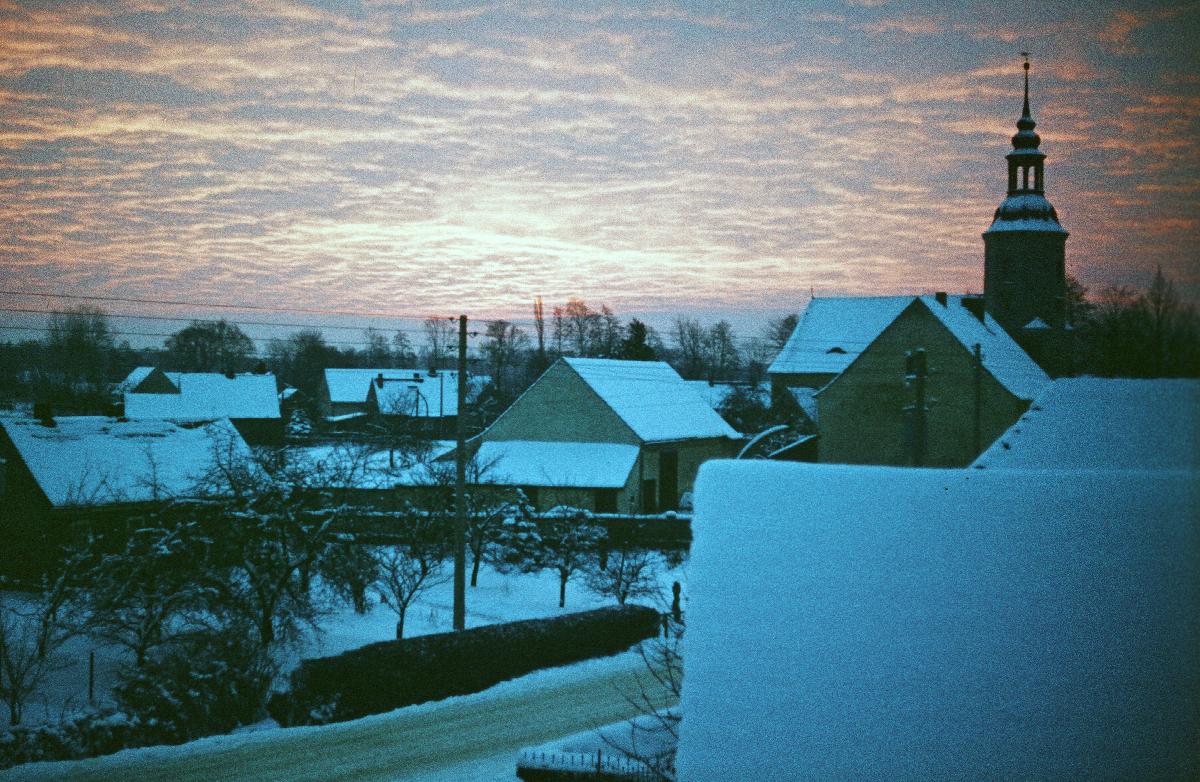 Schneebedeckte Ortschaft, Blick auf die Ullersdorfer Dorfkirche, Sonnenaufgang